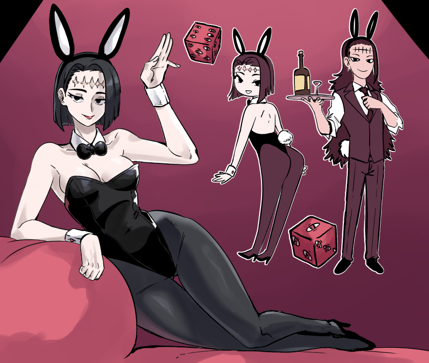 1boy 1girl animal_ear_hairband animal_ears black_leotard bob_cut bow bowtie breasts champagne_bottle champagne_flute cleavage cube cup detached_collar drinking_glass fake_animal_ears fake_tail geto_suguru geto_suguru_(kenjaku) hairband highleg highleg_leotard itadori_kaori japanese_clothes jujutsu_kaisen kenjaku leotard lying multiple_views on_side piercing playboy_bunny possessed prison_realm_(jujutsu_kaisen) rabbit_ear_hairband rabbit_ears rabbit_tail red_background scar scar_on_face scar_on_forehead stitched_face stitched_forehead stitches tail tray vest wanderjegson white_wrist_cuffs wrist_cuffs