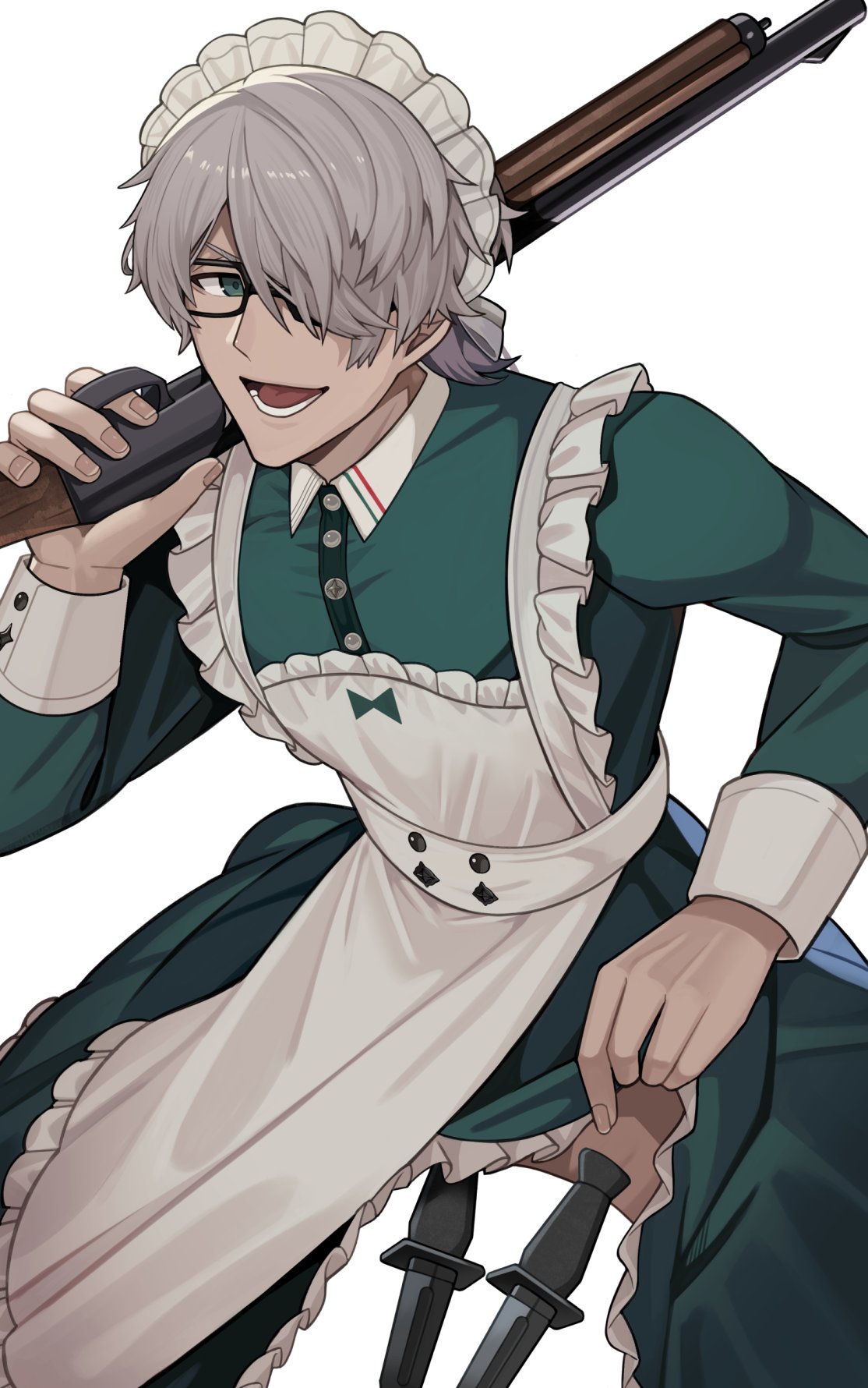 1boy alternate_costume apron arurandeisu arurandeisu_(4th_costume) button_dress buttons clothes_lift collared_dress commentary_request cowboy_shot crossdressing crossdressing_(mtf) dark-skinned_male dark_skin double-breasted dress dress_lift enmaided frilled_apron frills glasses green_dress grey_hair gun hair_over_one_eye highres holding holding_gun holding_weapon holostars knife knife_sheath lifting_own_clothes long_sleeves maid maid_apron maid_headdress male_focus male_maid official_alternate_costume sheath shotgun simple_background sleeve_cuffs solo virtual_youtuber weapon white_apron white_background xxmabukaxx