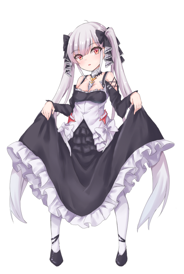 1girl aged_down alternate_breast_size_(smaller) azur_lane between_breasts black_shoes breasts choker clothes_between_breasts clothes_lift commentary_request dress formidable_(azur_lane) frilled_dress frills grey_hair hair_ribbon lifting_own_clothes long_hair looking_at_viewer pantyhose parted_lips red_eyes ribbon shoes skirt skirt_lift solo twintails very_long_hair white_background white_choker white_pantyhose ynp