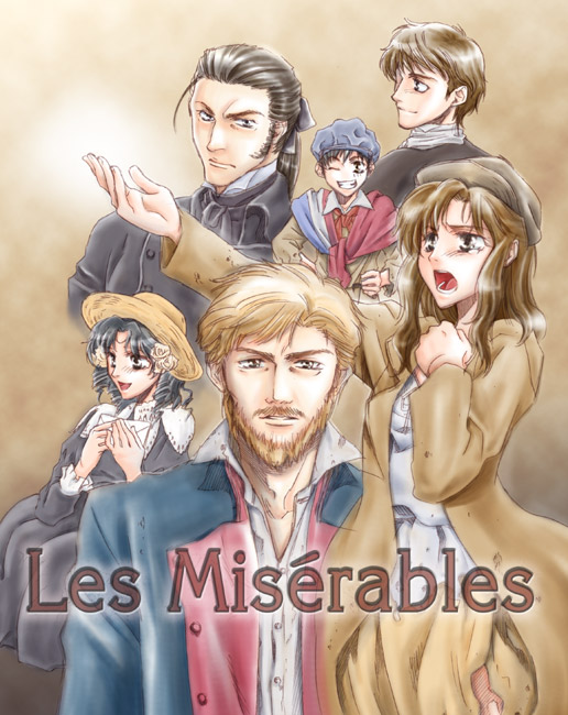 2girls 4boys character_request french_text javert jean_valjean les_miserables looking_at_viewer looking_to_the_side multiple_boys multiple_girls pointing pointing_up simple_background takano_saku
