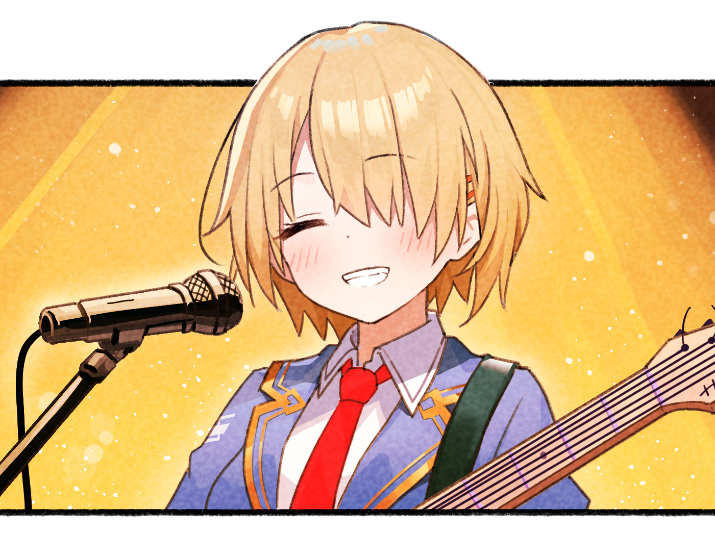 1girl :d ^_^ blonde_hair blue_jacket blush closed_eyes collared_shirt commentary_request facing_viewer grin guitar hair_ornament hair_over_one_eye hairclip heaven_burns_red instrument jacket kayamori_ruka long_bangs microphone microphone_stand necktie one_eye_covered open_clothes open_jacket open_mouth outside_border parallel_hairclips red_necktie rinki_oohen shirt short_hair simple_background smile solo spotlight upper_body white_shirt yellow_background