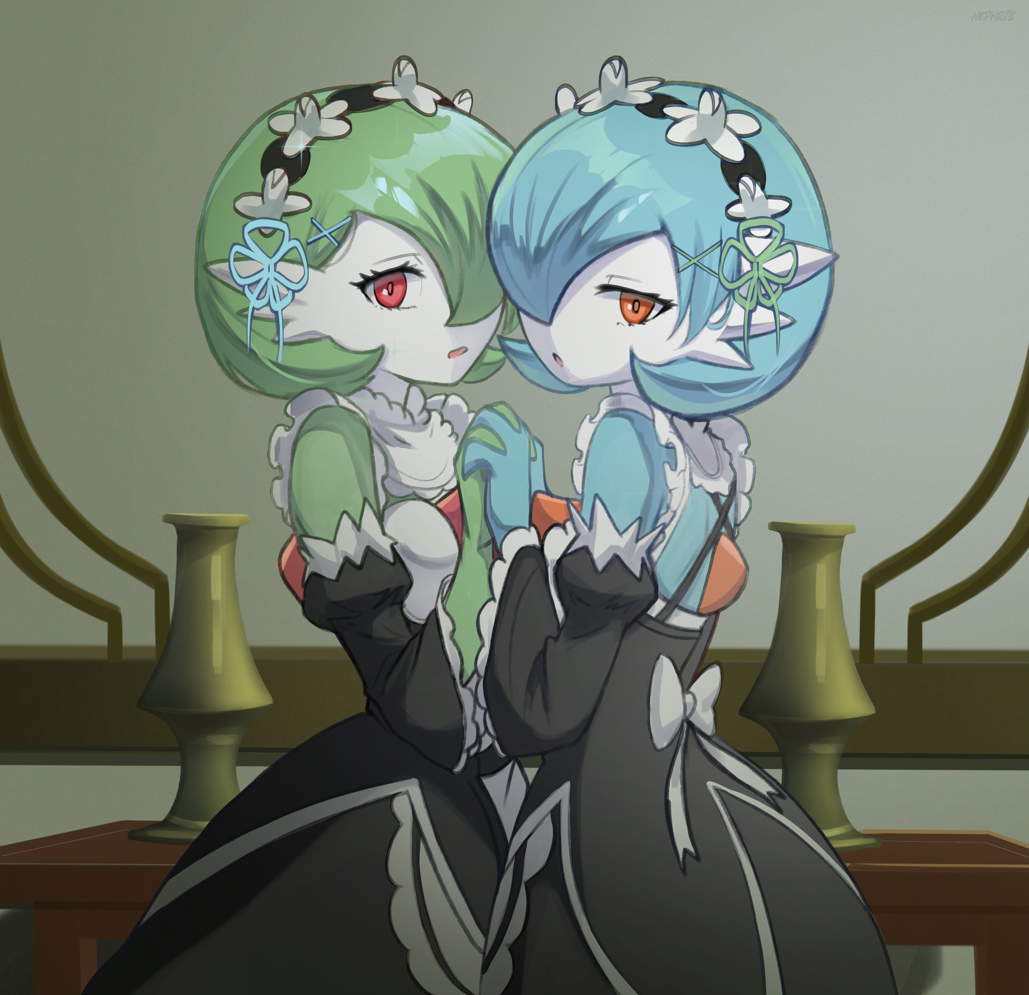 absurdres blue_hair bob_cut breasts colored_skin commentary detached_sleeves dress frills gardevoir gen_3_pokemon green_hair green_skin hair_ornament hair_over_one_eye hair_ribbon highres looking_at_viewer maid maid_headdress multicolored_skin nephrite_(nephrite_fur) nintendo pink_hair pink_ribbon pokemon pokemon_(creature) ram_(re:zero) re:zero_kara_hajimeru_isekai_seikatsu red_eyes rem_(re:zero) ribbon roswaal_mansion_maid_uniform short_hair two-tone_skin untranslatable_commentary white_skin x_hair_ornament