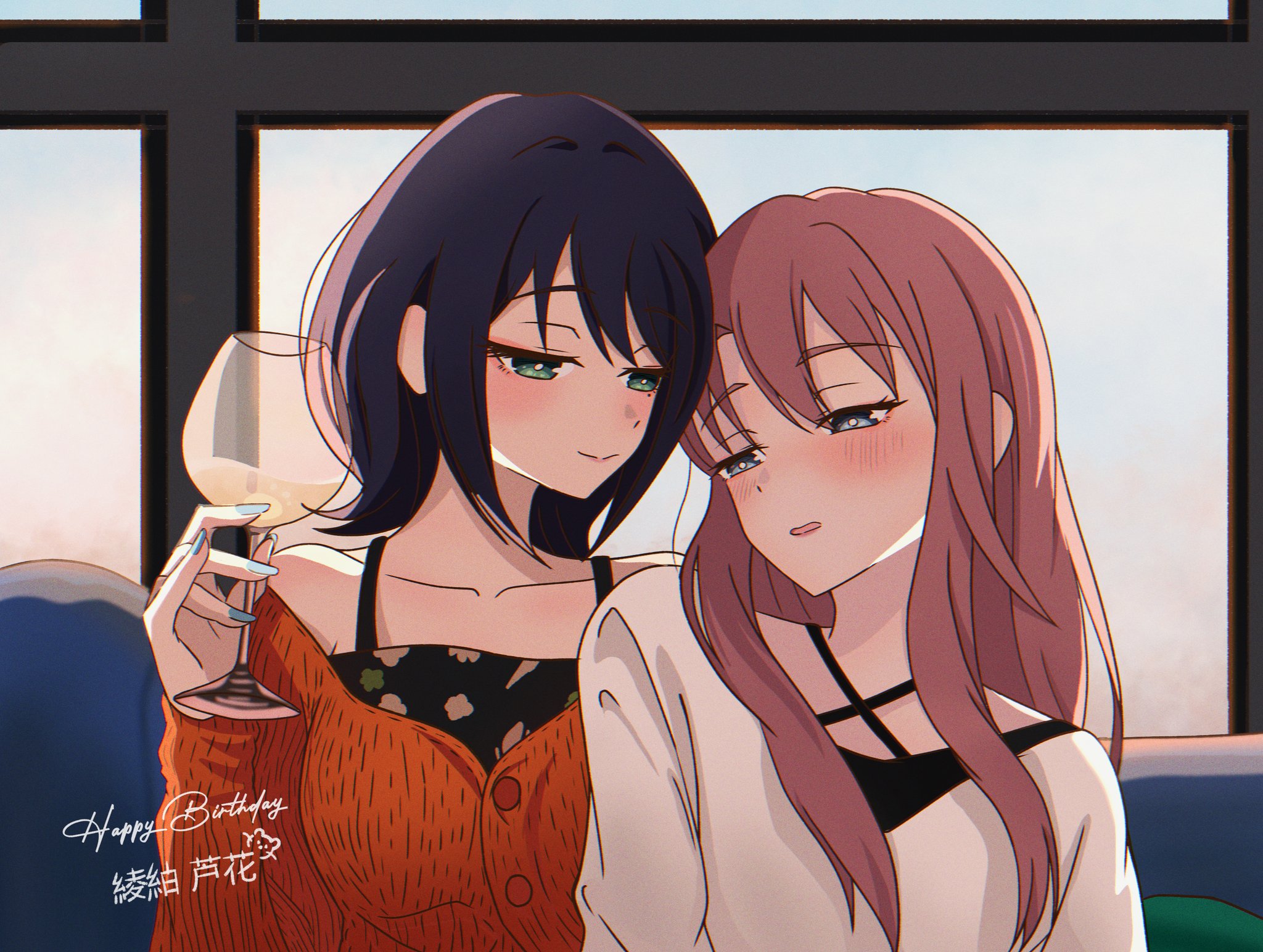 2girls airopopsart ayatsumugi_roka bare_shoulders black_hair blue_eyes blue_nails blush character_name cho_kaguya-hime! collarbone commentary cup drinking_glass english_text ferret green_eyes happy_birthday highres holding holding_cup long_hair looking_at_another medium_hair mole mole_under_eye multiple_girls parted_lips pink_hair sakayori_iroha translated upper_body window wine_glass yuri