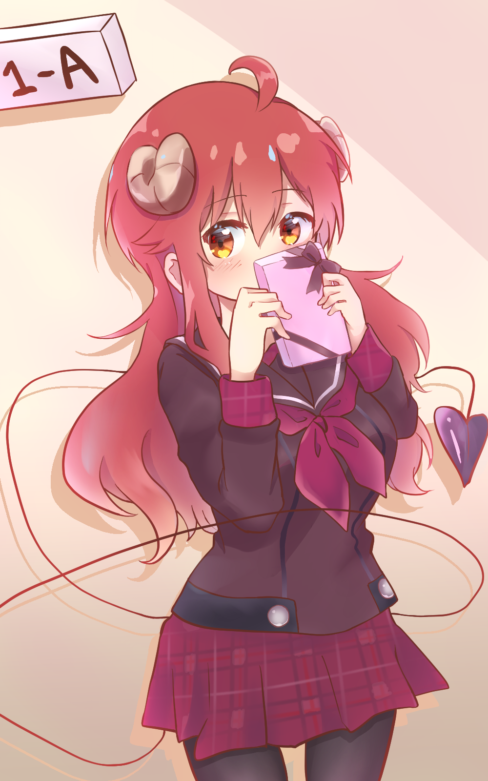 1girl ahoge black_jacket black_pantyhose blue_sailor_collar blush box brown_eyes commentary_request covering_own_mouth cowboy_shot curled_horns demon_girl demon_horns demon_tail drop_shadow expressive_tail gift hallway hands_up highres holding holding_box holding_gift horns implied_yuri indoors jacket long_hair long_sleeves looking_at_viewer machikado_mazoku miniskirt neckerchief pantyhose red_hair red_neckerchief sailor_collar school school_uniform serafuku skirt solo tail tareme umetsukimochi valentine very_long_tail yoshida_yuuko yuri