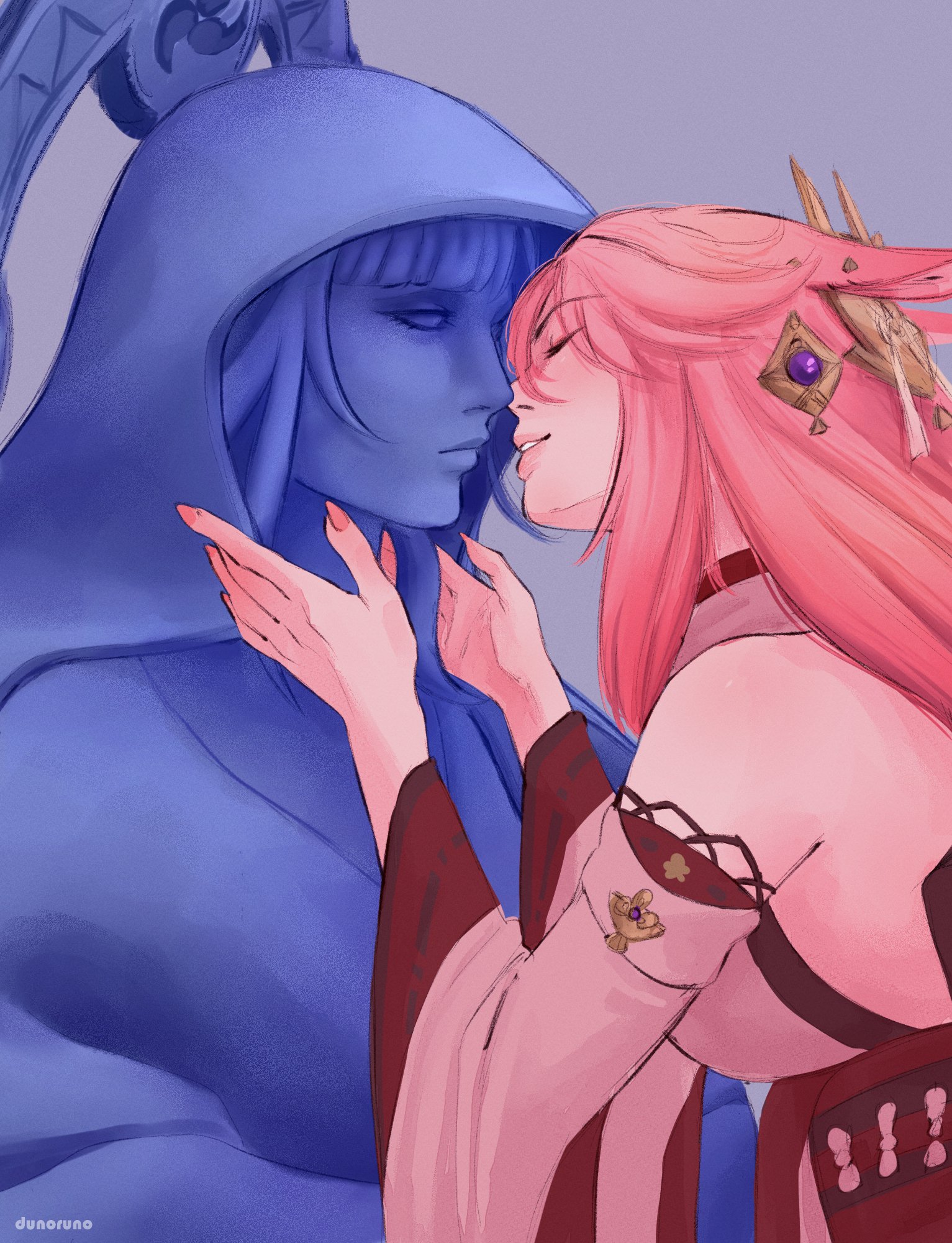 1girl animal_ear_piercing animal_ears artist_name bare_shoulders closed_eyes commentary detached_sleeves dunoruno fingernails fox_ears fox_girl from_side genshin_impact hair_between_eyes hair_ornament headpiece highres implied_yuri incoming_kiss japanese_clothes leaning_forward long_fingernails long_hair long_sleeves parted_lips pink_hair pink_lips pink_nails purple_background raiden_shogun robe solo statue statue_of_the_seven thick_lips upper_body veil wide_sleeves yae_miko yuri