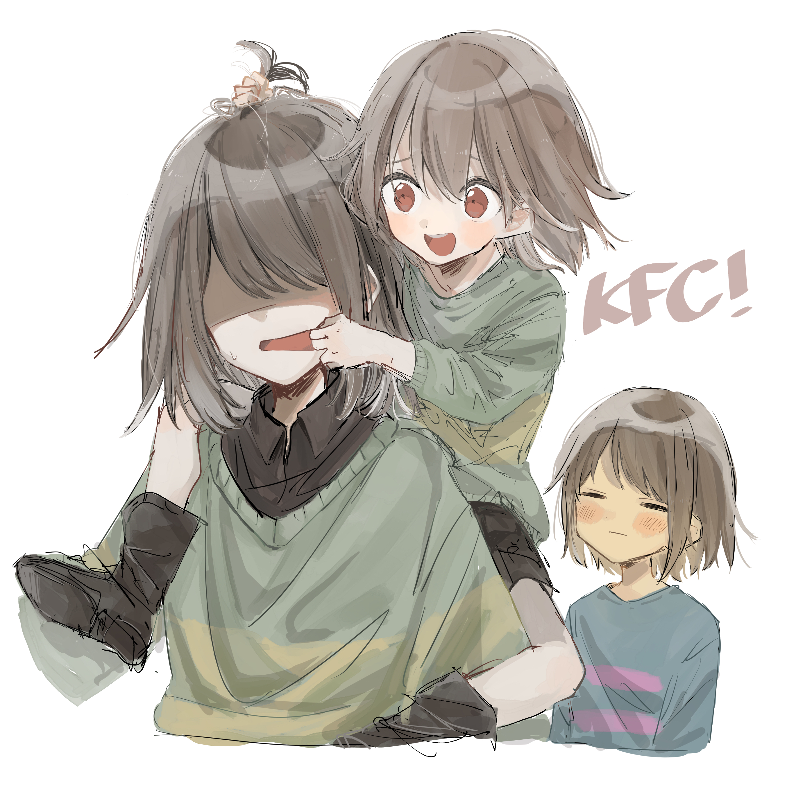 3others :d :| =_= absurdres age_difference ankle_boots antenna_hair arms_at_sides bare_legs black_boots black_shirt black_shorts blue_shirt blush bob_cut boots brown_hair carrying chara_(undertale) child closed_eyes closed_mouth collared_shirt commentary_request cropped_legs cropped_torso deltarune double-parted_bangs facing_ahead finger_in_another's_mouth frisk_(undertale) grabbing_another's_hair green_sweater hair_behind_ear hair_between_eyes highres holding_another's_hair in-franchise_crossover kris_(deltarune) long_sleeves looking_at_another multiple_others no_eyes open_mouth other_focus piggyback pink_shirt puffy_long_sleeves puffy_sleeves red_eyes round_teeth shaded_face shirt short_hair shorts sidelocks simple_background sketch smile soratake_53 striped_clothes striped_shirt striped_sweater sweatdrop sweater swept_bangs tareme teeth tongue two-tone_shirt two-tone_sweater undertale upper_teeth_only utdr_(toby_fox) white_background yellow_sweater