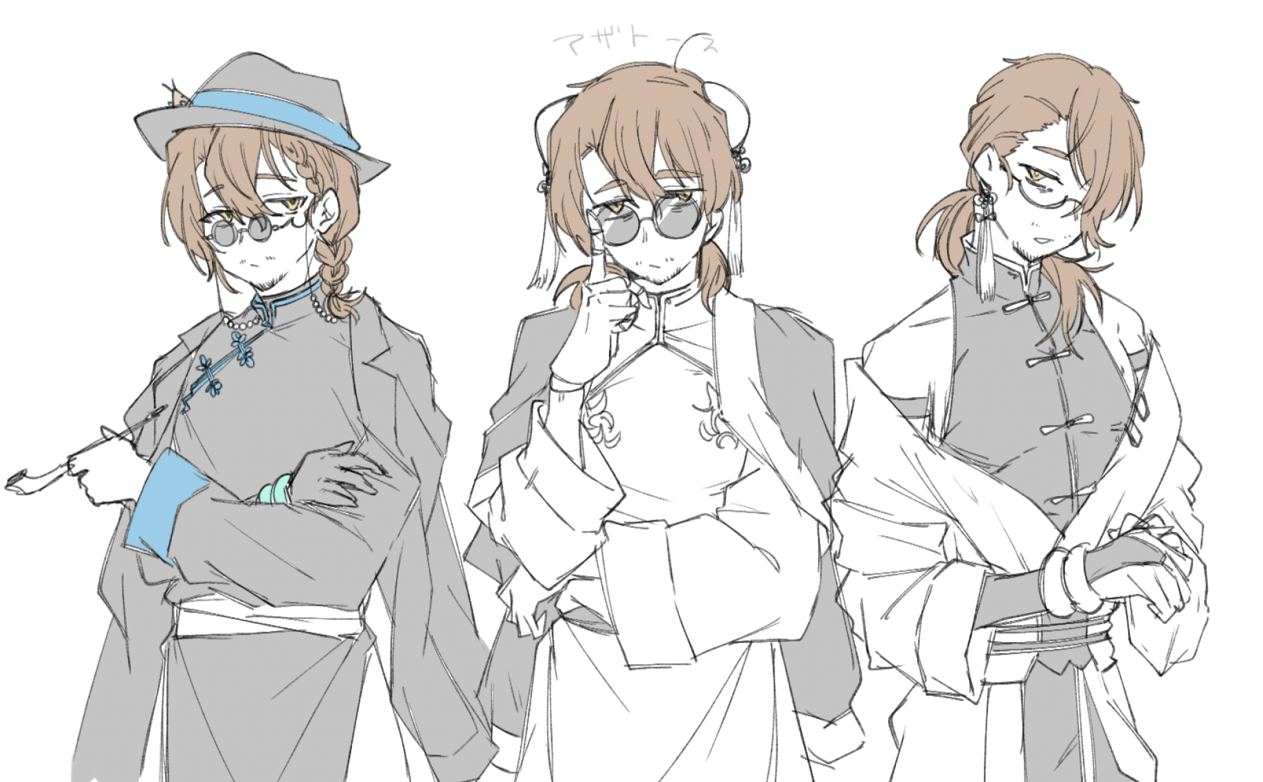 3boys :/ absurdres adjusting_eyewear ahoge alternate_costume armband asymmetrical_hair beard_stubble black_coat black_dress black_gloves black_hat black_jacket bracelet braid braided_ponytail bridal_gauntlets brown_hair bug bun_cover china_dress chinese_clothes chinese_knot cinq_association_east_uniform closed_mouth coat coat_on_shoulders cockroach cowboy_shot crossdressing crossed_arms double_bun dress earrings facial_hair fedora flower_knot glasses gloves gregor's_cockroach_(project_moon) gregor_(project_moon) hair_behind_ear hair_between_eyes hair_bun hair_over_one_eye hair_over_shoulder half-closed_eyes hand_up hat head_tilt highres holding holding_smoking_pipe insect insect_on_head jacket jacket_on_shoulders jewelry jitome kiseru lapels lily26983455 limbus_company long_hair long_sleeves looking_at_another looking_at_viewer looking_to_the_side low_ponytail male_focus monochrome multiple_boys multiple_persona notched_lapels off_shoulder one_eye_covered open_mouth own_hands_together pants parted_bangs pelvic_curtain pince-nez ponytail project_moon rectangular_eyewear round_eyewear sash side_braid side_bun simple_background single_braid single_glove sketch sleeveless smoking_pipe spot_color standing stubble sunglasses tangzhuang tassel tassel_earrings tinted_eyewear turtleneck turtleneck_dress upper_body variations waist_sash white_background white_pants white_sash yellow_eyes