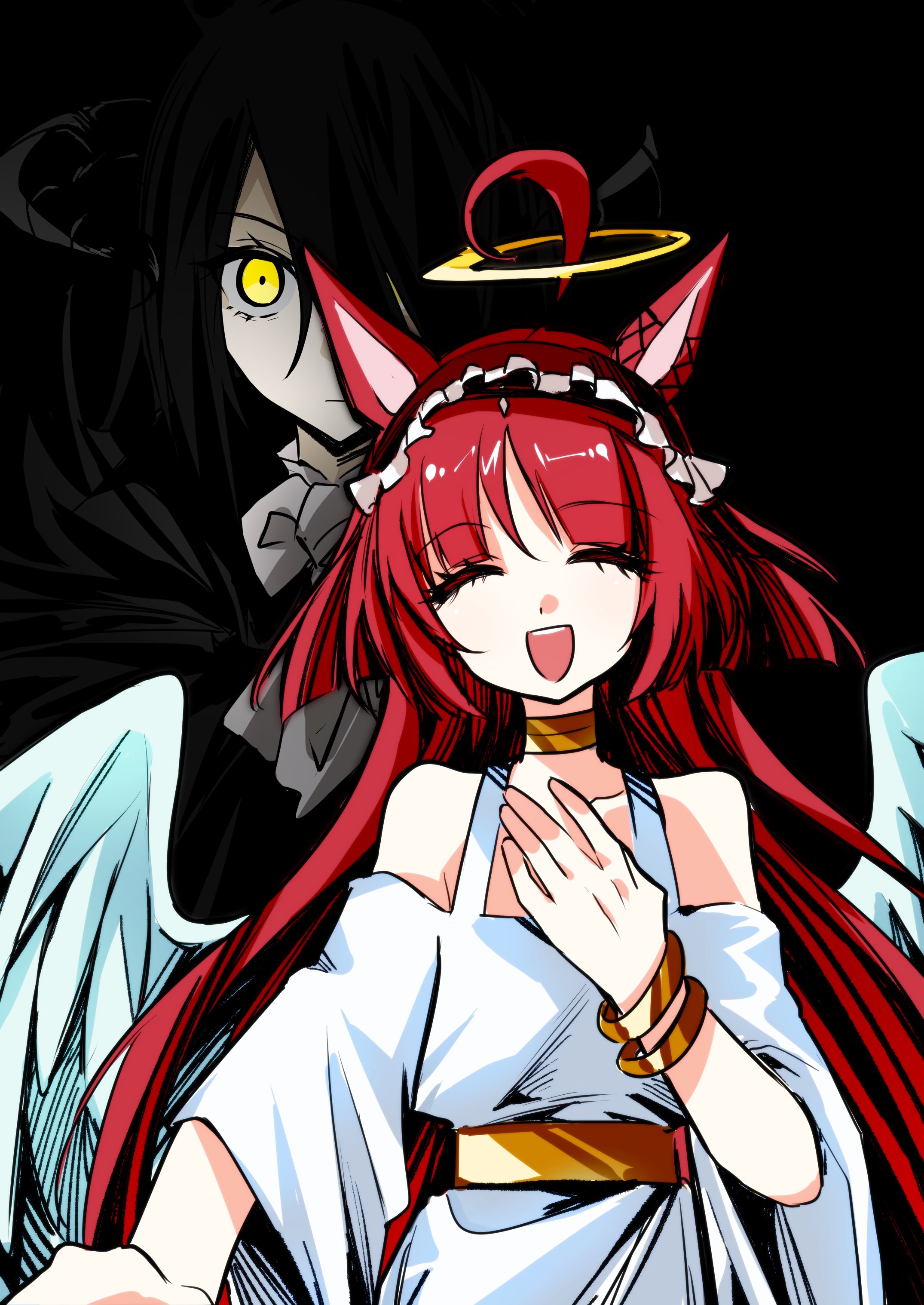2girls absurdres angel_wings animal_ears ark_koiz35 black_background black_hair bracelet closed_eyes clothing_cutout collarbone commentary dress gold_choker halo highres horse_ears horse_girl jewelry long_hair long_sleeves looking_at_viewer manhattan_cafe_(umamusume) multiple_girls open_mouth red_desire_(umamusume) shoulder_cutout simple_background umamusume umamusume_horse_relations untranslatable_commentary upper_body white_dress white_wings wings yellow_eyes