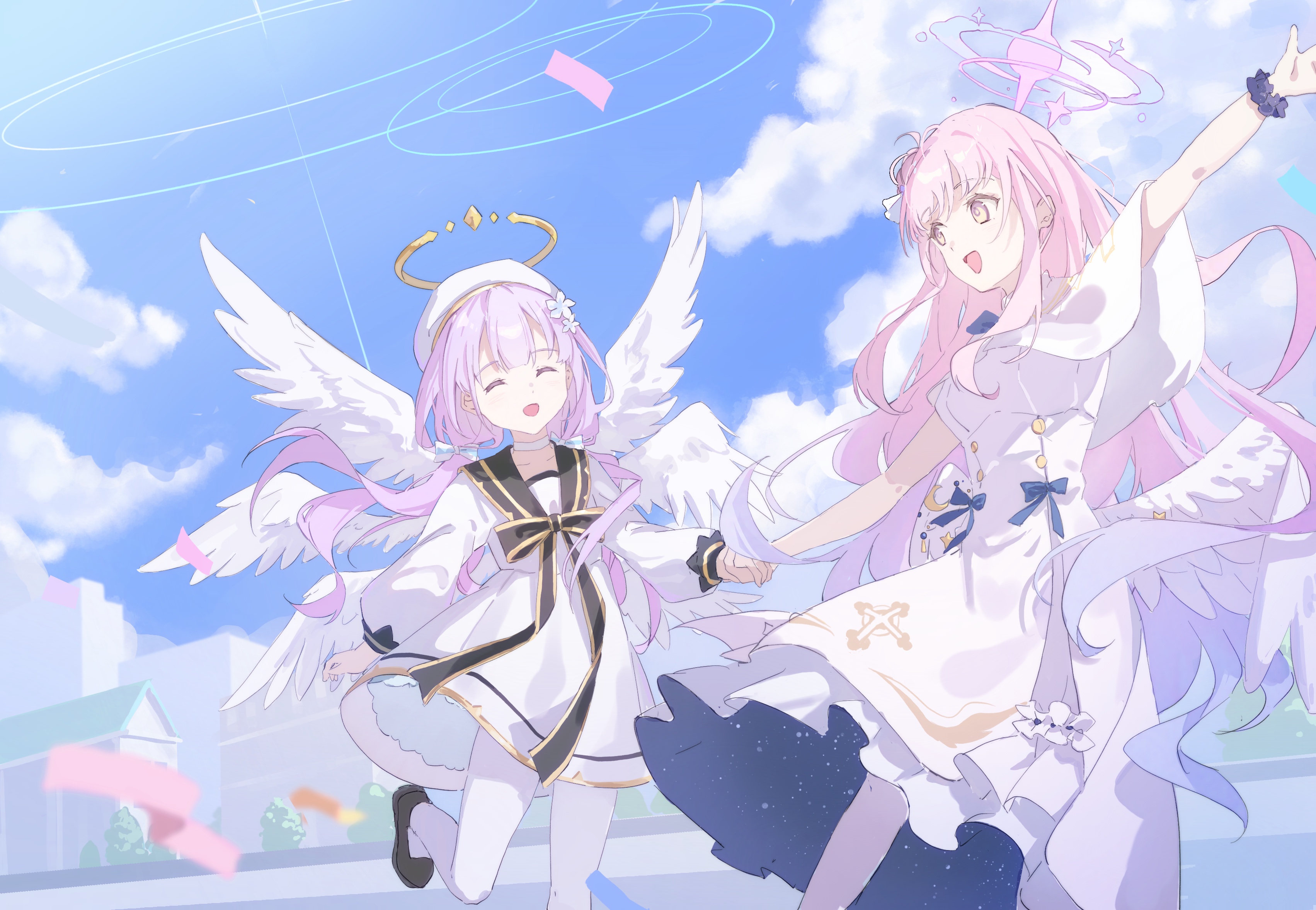 2girls :d ^_^ absurdres angel angel_wings arm_up beret black_ribbon black_sailor_collar black_shoes blue_archive blue_sky bow bright_pupils buttons capelet choker closed_eyes cloud cloudy_sky color_connection confetti crossover day dot_nose double-breasted dress empire_waist facing_another feathered_wings flower gold_halo gradient_hair hair_bow hair_flower hair_ornament halo hat highres holding_hands kafuuchino_(chouti) leg_up long_hair long_sleeves looking_at_another low_twintails low_wings maimai_(game) mika_(blue_archive) multicolored_hair multiple_girls multiple_wings name_connection neck_ribbon open_mouth outdoors pantyhose pink_hair pink_halo puffy_long_sleeves puffy_sleeves ribbon ring_of_light_(blue_archive) sailor_collar sailor_dress scrunchie seraph shoes short_dress sky sleeveless sleeveless_dress smile species_connection starry_sky_print trait_connection twintails two-sided_dress two-sided_fabric very_long_hair white_bow white_capelet white_choker white_dress white_flower white_hat white_pantyhose white_wings wings wrist_scrunchie yellow_eyes yurisaki_mika_(maimai)