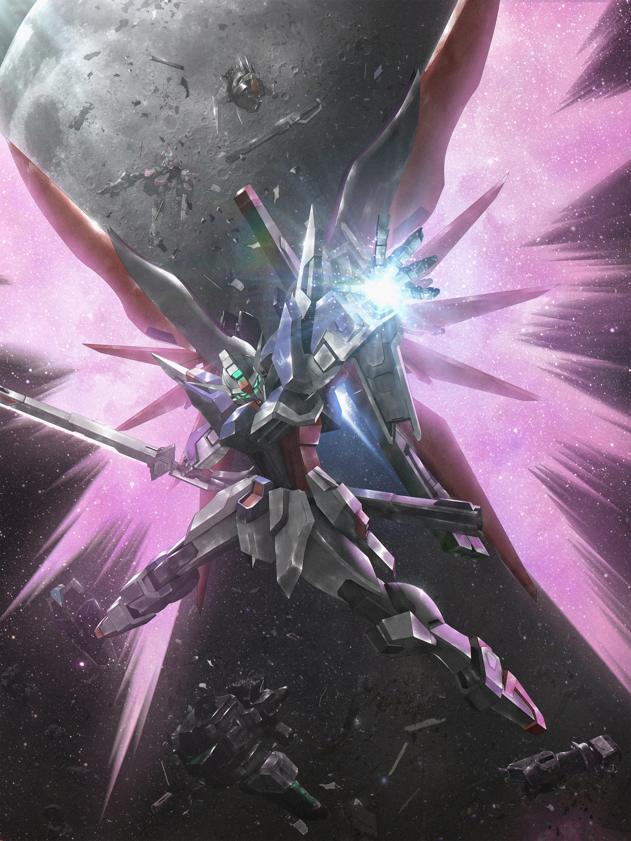 absurdres boshi_(atuki_mk2) commentary_request destiny_gundam destiny_gundam_spec_ii energy_sword energy_wings glowing glowing_eyes green_eyes gundam gundam_seed gundam_seed_freedom highres holding holding_sword holding_weapon light_particles looking_at_viewer mecha mecha_focus mechanical_wings mobile_suit no_humans robot science_fiction solo space sword v-fin weapon wings