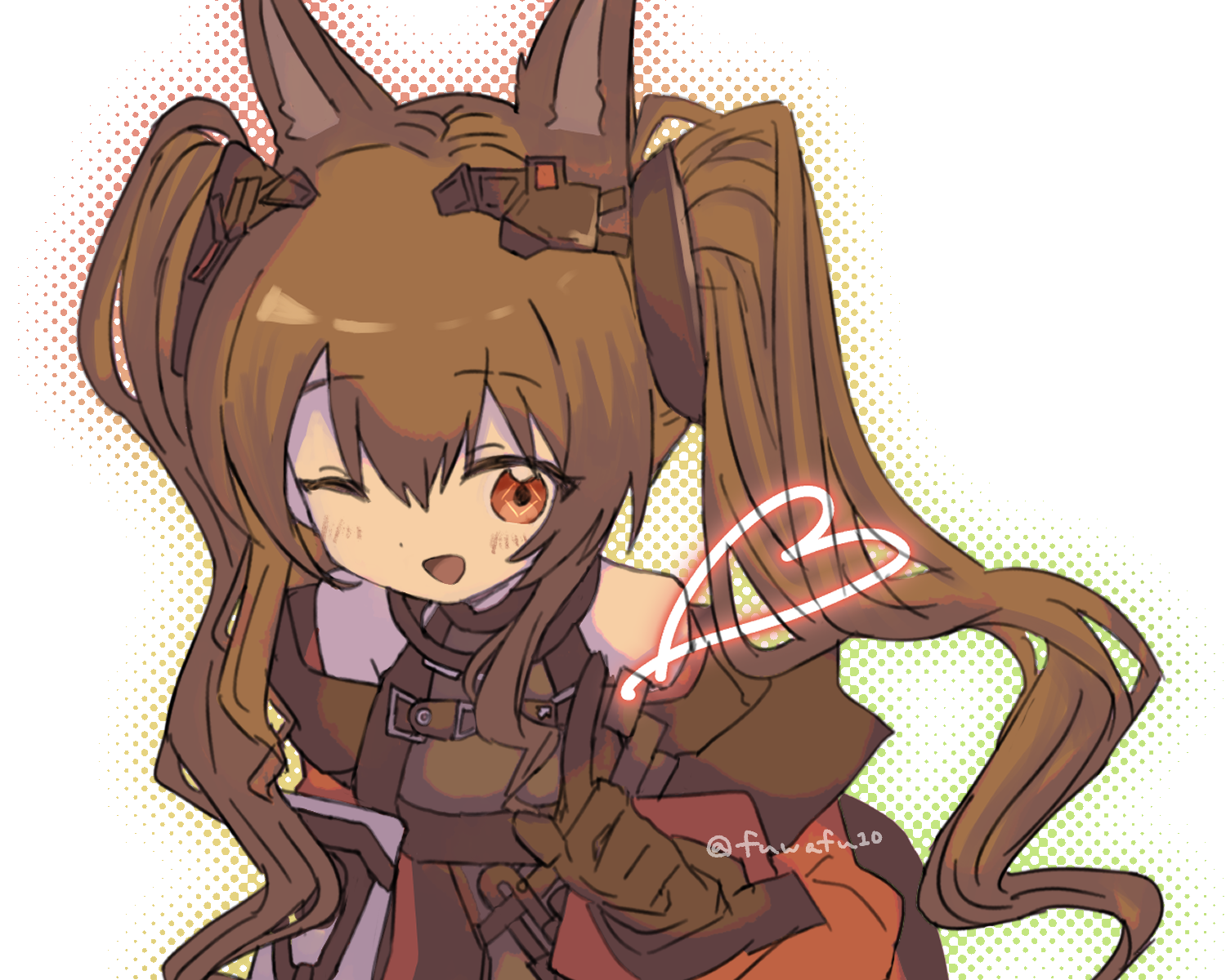 1girl :d angelina_(arknights) animal_ear_fluff animal_ears arknights arknights:_endfield bare_shoulders black_dress black_gloves breasts brown_hair coat commentary deformed diamond-shaped_pupils diamond_(shape) dot_nose double-parted_bangs drawn_heart dress elbow_gloves fox_ears fox_girl fu-ka_(fuwafu10) gilberta_(arknights) gloves hair_between_eyes headpiece high_collar highres long_hair long_sleeves looking_at_viewer medium_breasts off_shoulder one_eye_closed open_clothes open_coat open_mouth red_coat red_eyes sleeveless sleeveless_dress smile solo symbol-shaped_pupils twintails twitter_username white_background