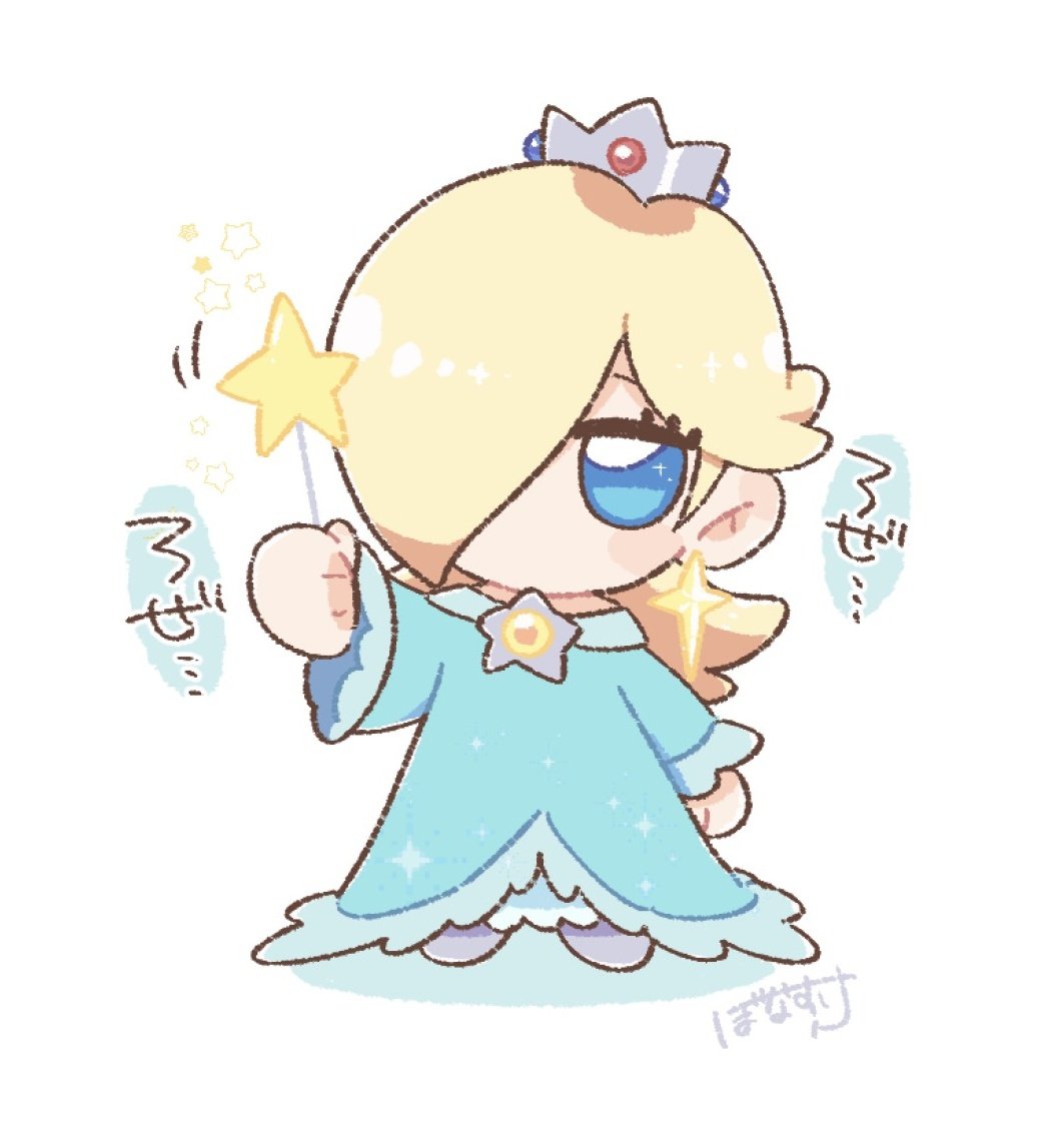 1girl blonde_hair blue_dress blue_eyes bonappetit_suke brooch chibi chibi_only commentary_request crown dress earrings eyelashes full_body hair_over_one_eye holding holding_wand jewelry long_hair long_sleeves looking_at_viewer mario_(series) nintendo no_mouth rosalina solo star_(symbol) star_brooch star_earrings translation_request wand white_background