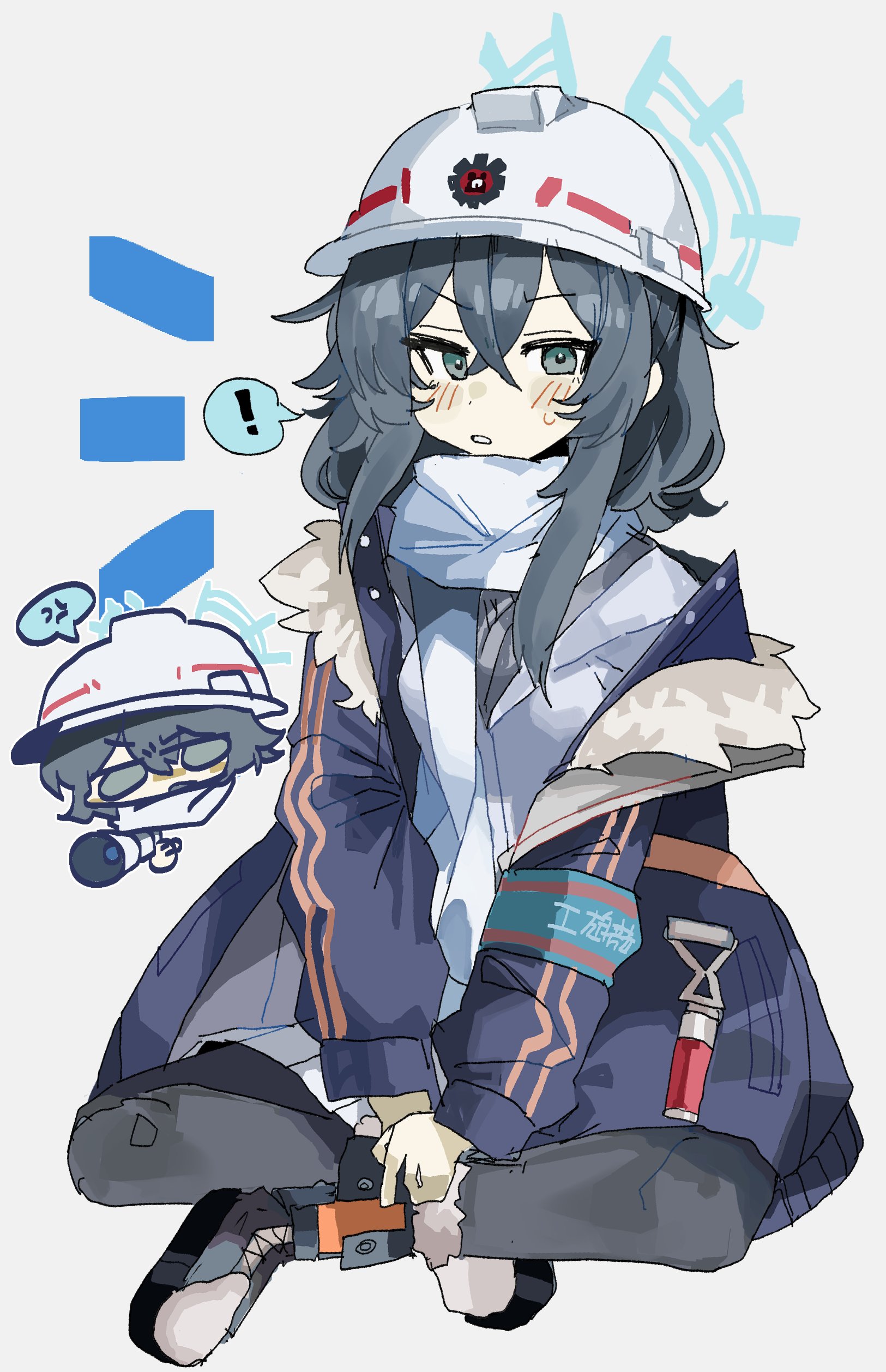 1girl absurdres armband black_boots black_hair blue_archive blue_armband blue_coat blue_halo blush boots coat fur_trim green_eyes hair_between_eyes halo hard_hat helmet highres indian_style jacket lace-up_boots long_hair long_sleeves looking_at_viewer minori_(blue_archive) odmised open_clothes scarf shirt sidelocks simple_background sitting solo white_background white_helmet white_scarf white_shirt