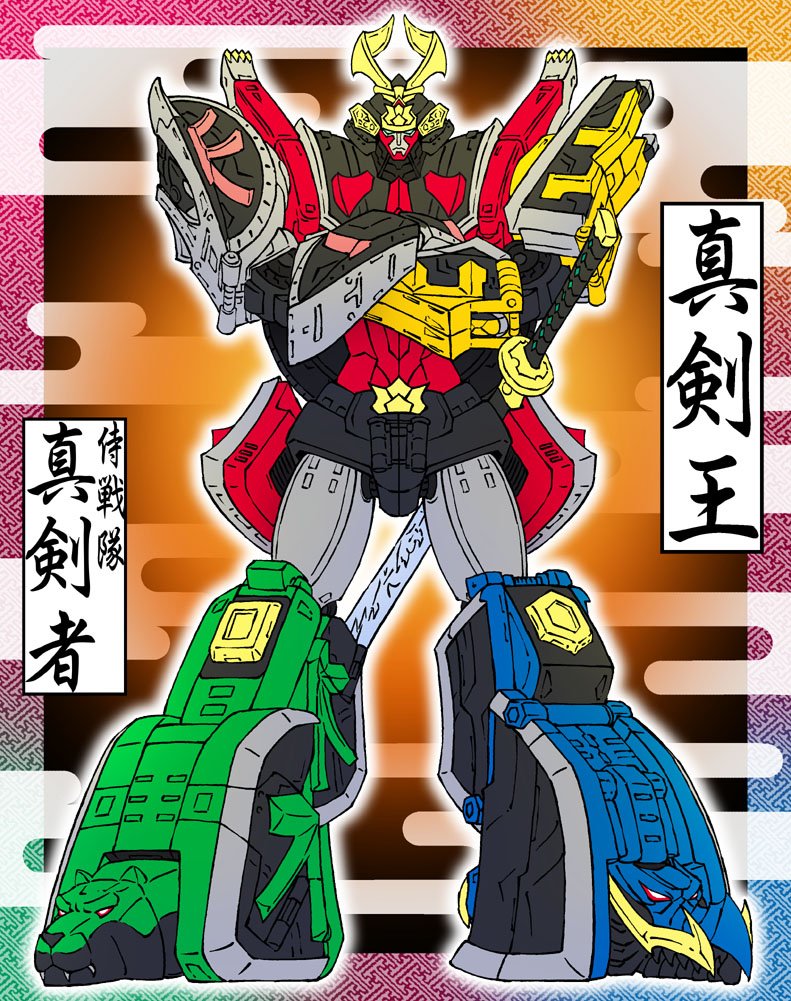 commentary_request crossed_arms gunbuster_pose looking_at_viewer mecha mecha_focus no_humans robot samurai_sentai_shinkenger shinken_ou solo super_robot super_sentai sword waku-jinpei weapon