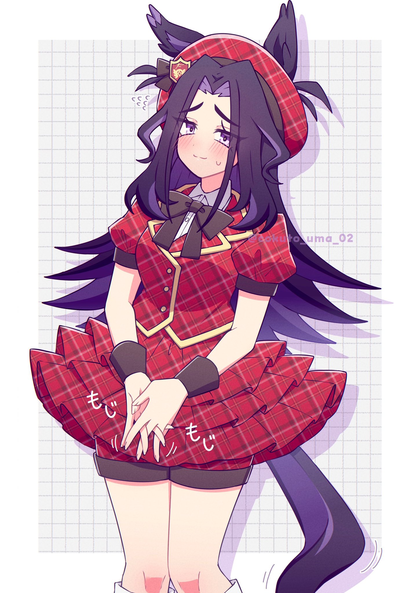 1girl animal_ears black_bow black_hair black_shorts black_wrist_cuffs blush bow breasts closed_mouth collared_shirt commentary ears_through_headwear fenomeno_(umamusume) flipped_hair hat highres horse_ears horse_girl horse_tail jacket long_hair looking_at_viewer multicolored_hair official_alternate_costume purple_eyes purple_hair red_jacket red_skirt shirt shorts shorts_under_skirt simple_background skirt sweatdrop tail umamusume w3n6e white_shirt wrist_cuffs
