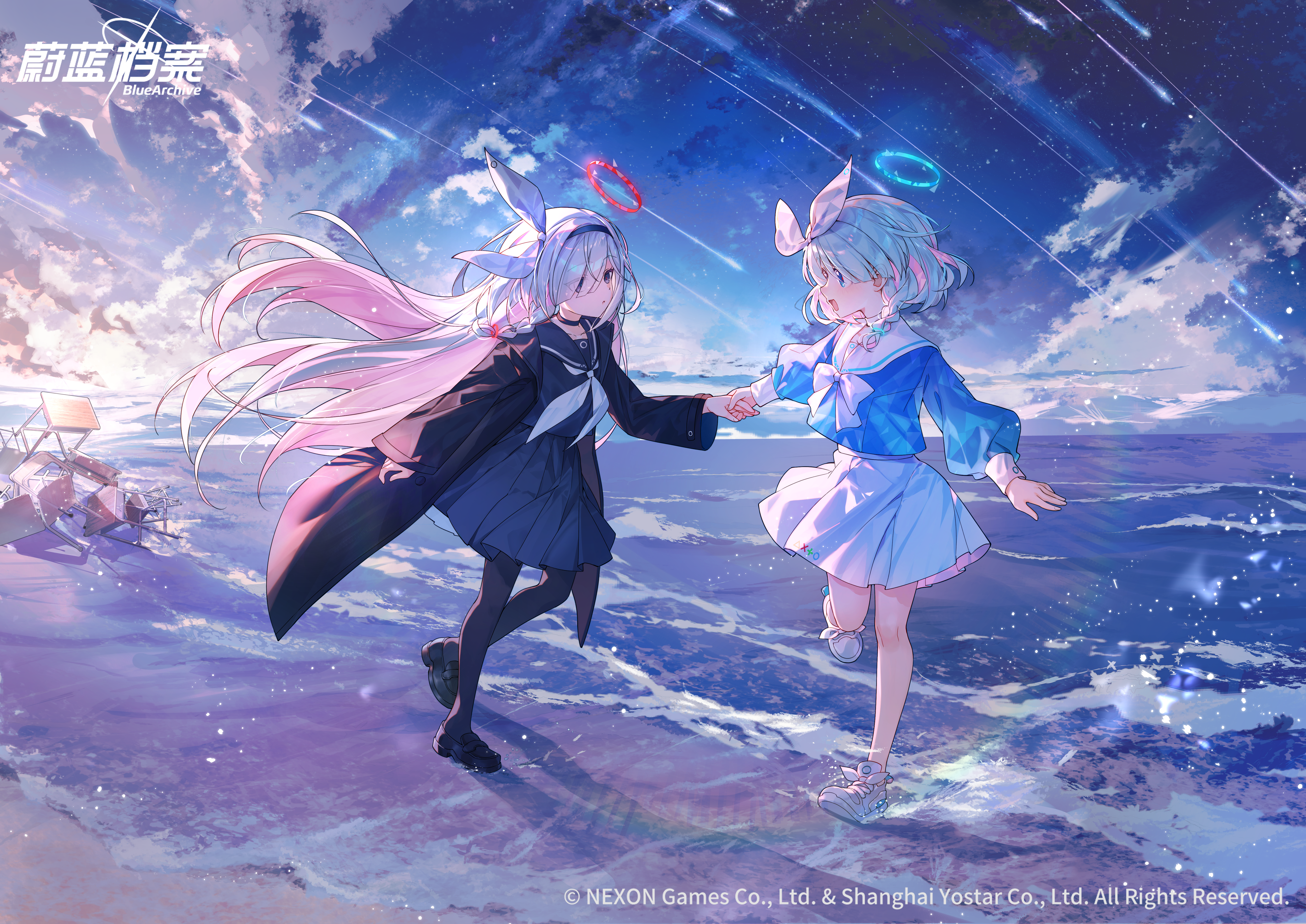 2girls absurdres arona_(blue_archive) beach bison_cangshu black_choker black_coat black_eyes black_hairband black_pantyhose black_sailor_collar black_serafuku black_shirt black_skirt blue_archive blue_eyes blue_hair blue_halo blue_shirt blue_sky blush bow bowtie braid chinese_commentary choker cloud cloudy_sky coat colored_inner_hair commentary_request copyright_logo copyright_notice desk face-to-face grey_hair hair_over_one_eye hairband halo highres holding_hands loafers logo long_hair looking_at_another multicolored_hair multiple_girls neckerchief ocean official_art open_mouth pantyhose pink_hair plana_(blue_archive) red_halo red_pupils ribbon sailor_collar sand school_desk school_uniform serafuku shirt shoes shooting_star short_hair side_braid skirt sky standing standing_on_one_leg waves white_bow white_bowtie white_hair white_hairband white_neckerchief white_ribbon white_sailor_collar white_shoes white_skirt