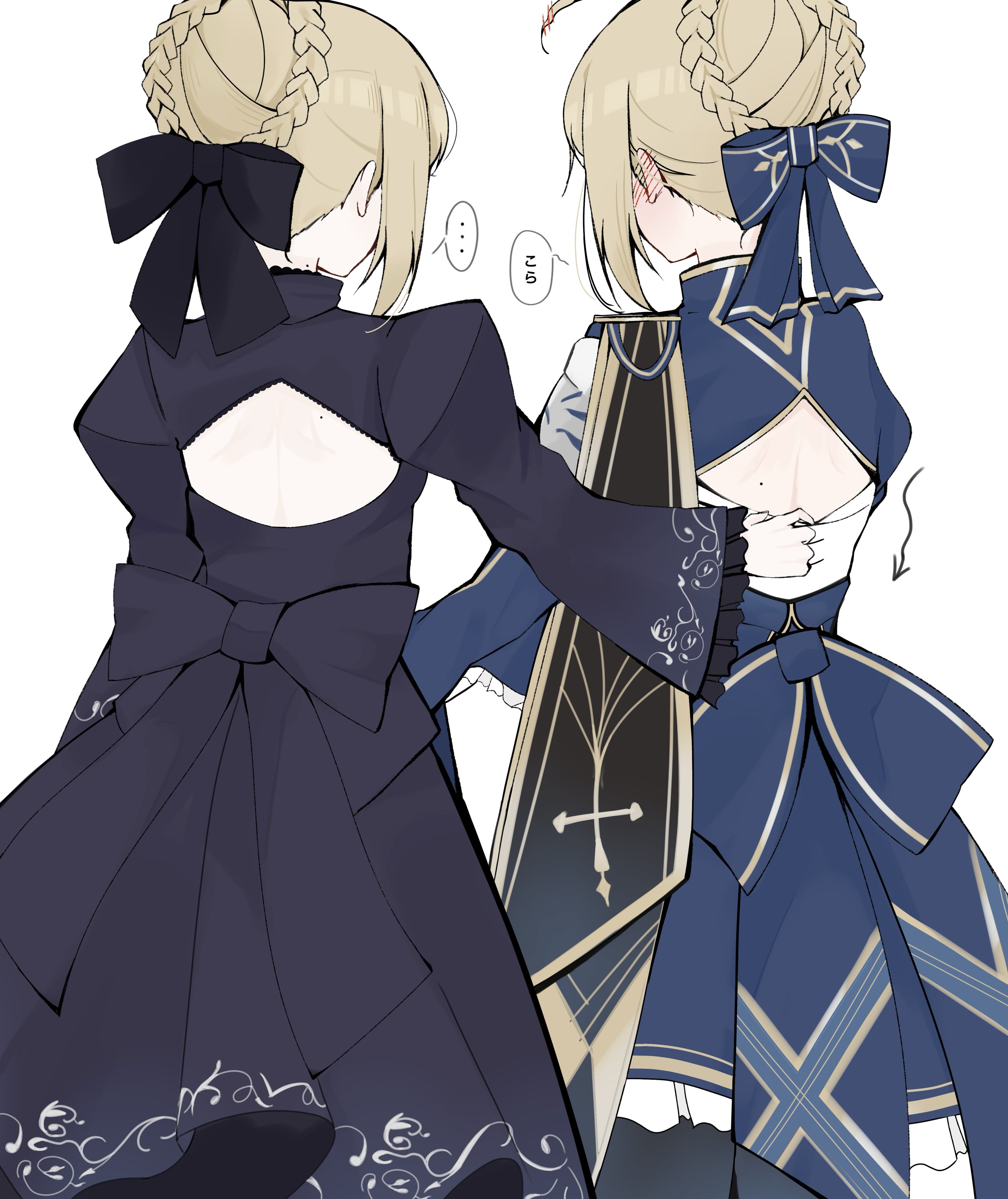 ... 2girls absurdres arrow_(symbol) artoria_pendragon_(fate) back_bow back_cutout black_bow blonde_hair blue_bow blue_dress bow clothing_cutout commentary dress fate/grand_order fate_(series) from_behind hair_bow hair_bun hayato_hoshi604 highres multiple_girls saber_(fate) saber_alter saber_alter_(third_ascension) simple_background single_hair_bun speech_bubble spoken_ellipsis white_background