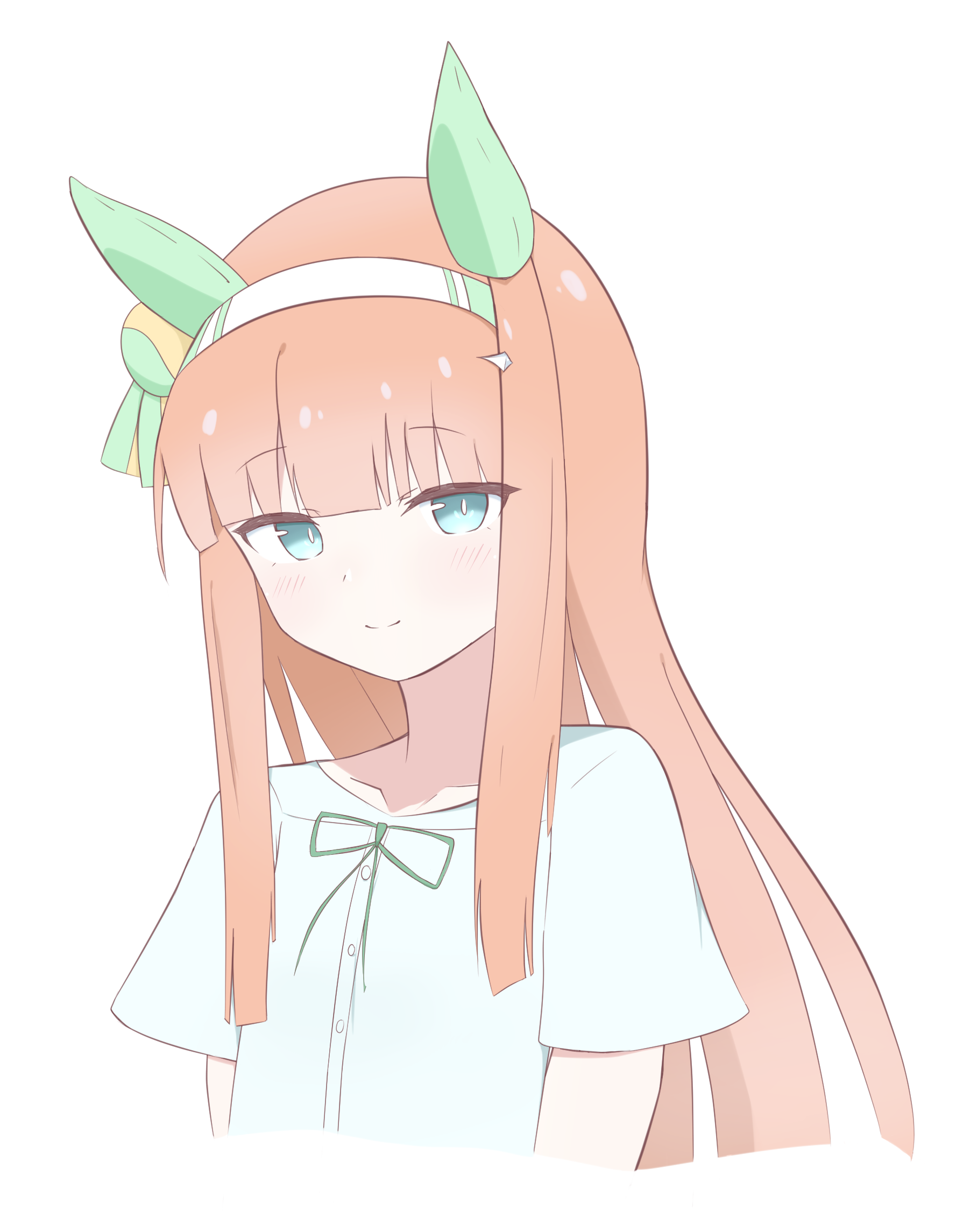 1girl akuku_e animal_ears aqua_eyes aqua_shirt commentary_request highres horse_ears horse_girl light_blush light_smile long_hair looking_at_viewer orange_hair shirt silence_suzuka_(umamusume) solo umamusume white_background
