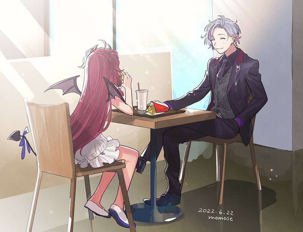 1boy 1girl ^_^ ahoge artist_name black_pants black_shoes blue_ribbon burger chair closed_eyes collared_shirt comb_over commentary crossed_legs cup dated demon_girl demon_horns demon_tail demon_wings disposable_cup dress dress_shoes eating elbow_on_table facing_another facing_away food french_fries frilled_dress frills full_body fuwa_minato fuwa_minato_(2nd_costume) grey_hair grey_vest hand_in_pocket hand_on_table holding holding_burger holding_food horns indoors jacket lapel_pin lapels long_hair long_sleeves mary_janes momose_(oqo) multicolored_hair necktie nijisanji notched_lapels open_clothes open_jacket pants pinstripe_pattern pinstripe_vest purple_jacket purple_necktie purple_shirt purple_streaks red_hair restaurant ribbon shirt shoes short_dress short_hair sitting sleeveless sleeveless_dress smile streaked_hair table tail tail_ornament tail_ribbon two_side_up untranslatable_commentary very_long_hair vest virtual_youtuber white_dress white_shoes window wings yuzuki_roa yuzuki_roa_(3rd_costume)