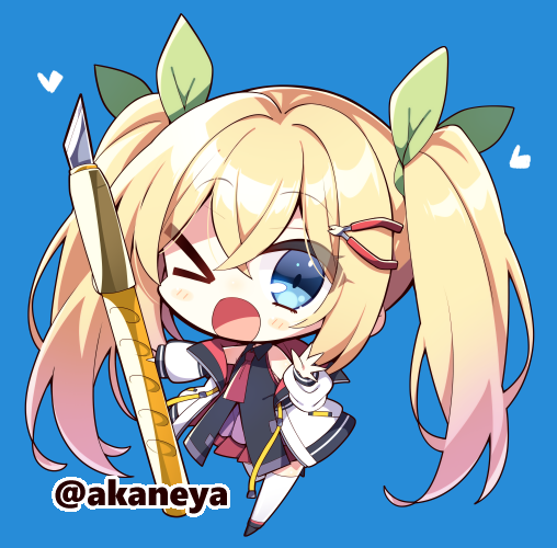 >_o 1girl ;d akaneya bare_shoulders black_shirt black_shoes blonde_hair blue_background blue_eyes blush_stickers character_request chibi chibi_only commentary_request commission copyright_request crossed_bangs double-parted_bangs full_body green_ribbon hair_between_eyes hair_ribbon jacket long_hair long_sleeves looking_at_viewer necktie off_shoulder one_eye_closed open_clothes open_jacket open_mouth pleated_skirt purple_skirt red_necktie ribbon shirt shoes simple_background skeb_commission skirt sleeveless sleeveless_shirt smile solo standing thighhighs twintails twitter_username very_long_hair white_jacket white_thighhighs