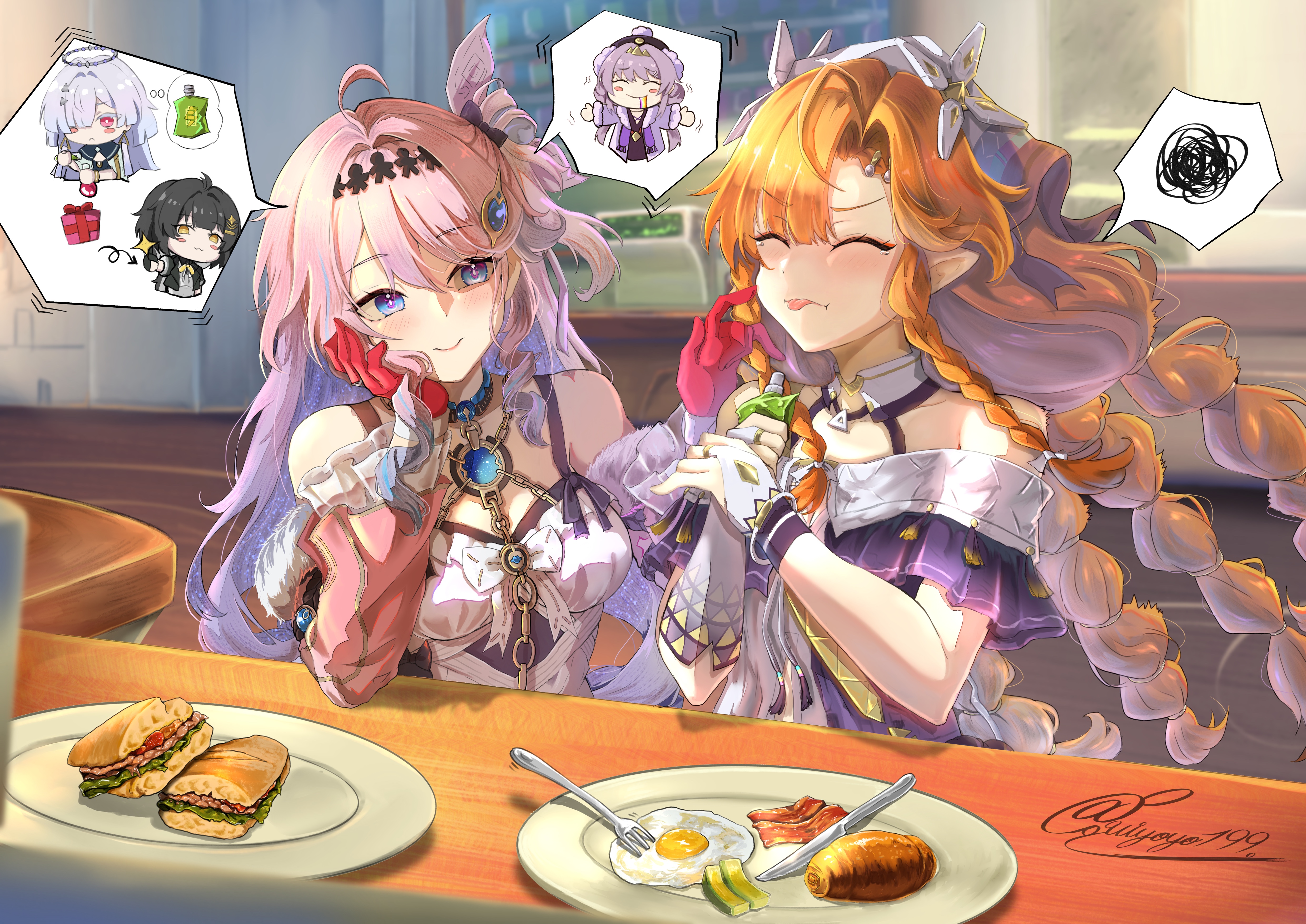 2girls absurdres ahoge bacon bare_shoulders bitter blue_eyes braid braided_sidelocks bread breasts bridal_gauntlets closed_eyes closed_mouth commentary denia_(wuthering_waves) detached_sleeves egg female_rover_(wuthering_waves) food gloves hair_intakes hair_ornament highres kouno_(uiyoyo199) long_hair looking_at_another medium_breasts mornye_(wuthering_waves) multiple_braids multiple_girls nivora_(wuthering_waves) orange_hair pink_hair plate pointy_ears red_gloves rover_(wuthering_waves) sandwich sidelocks signature sigrika_(wuthering_waves) smile spoken_character spoken_squiggle squiggle tongue tongue_out untranslatable_commentary veil white_bridal_gauntlets white_veil wuthering_waves