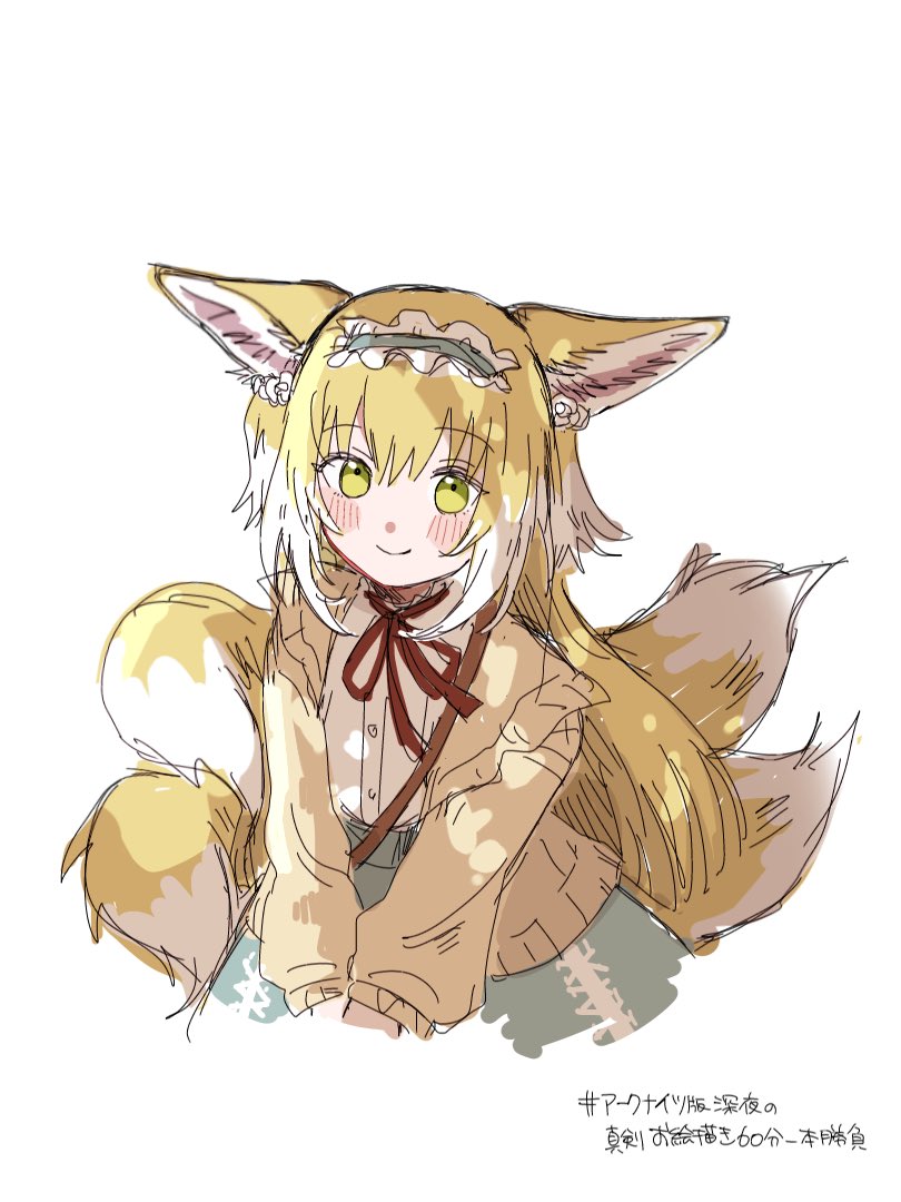 1girl animal_ears arknights blonde_hair cardigan closed_mouth colored_tips commentary_request fox_ears fox_girl fox_tail frilled_hairband frills green_eyes green_hairband green_skirt hairband kitsune kyuubi long_sleeves looking_at_viewer multicolored_hair multiple_tails n2e2k2o2_oxo neck_ribbon official_alternate_costume one-hour_drawing_challenge red_ribbon ribbon shirt simple_background sketch skirt smile solo suzuran_(arknights) suzuran_(spring_praise)_(arknights) tail two-tone_hair white_background white_hair white_shirt yellow_cardigan