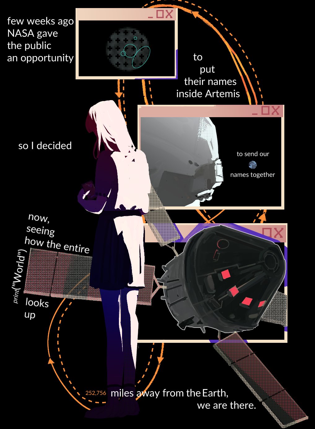 1girl artemis_ii artist_self-insert astronaut english_text from_behind full_body highres long_hair moon real_life shirt_tucked_in sidelighting skirt skirtsan solo space spacecraft standing window_(computing)