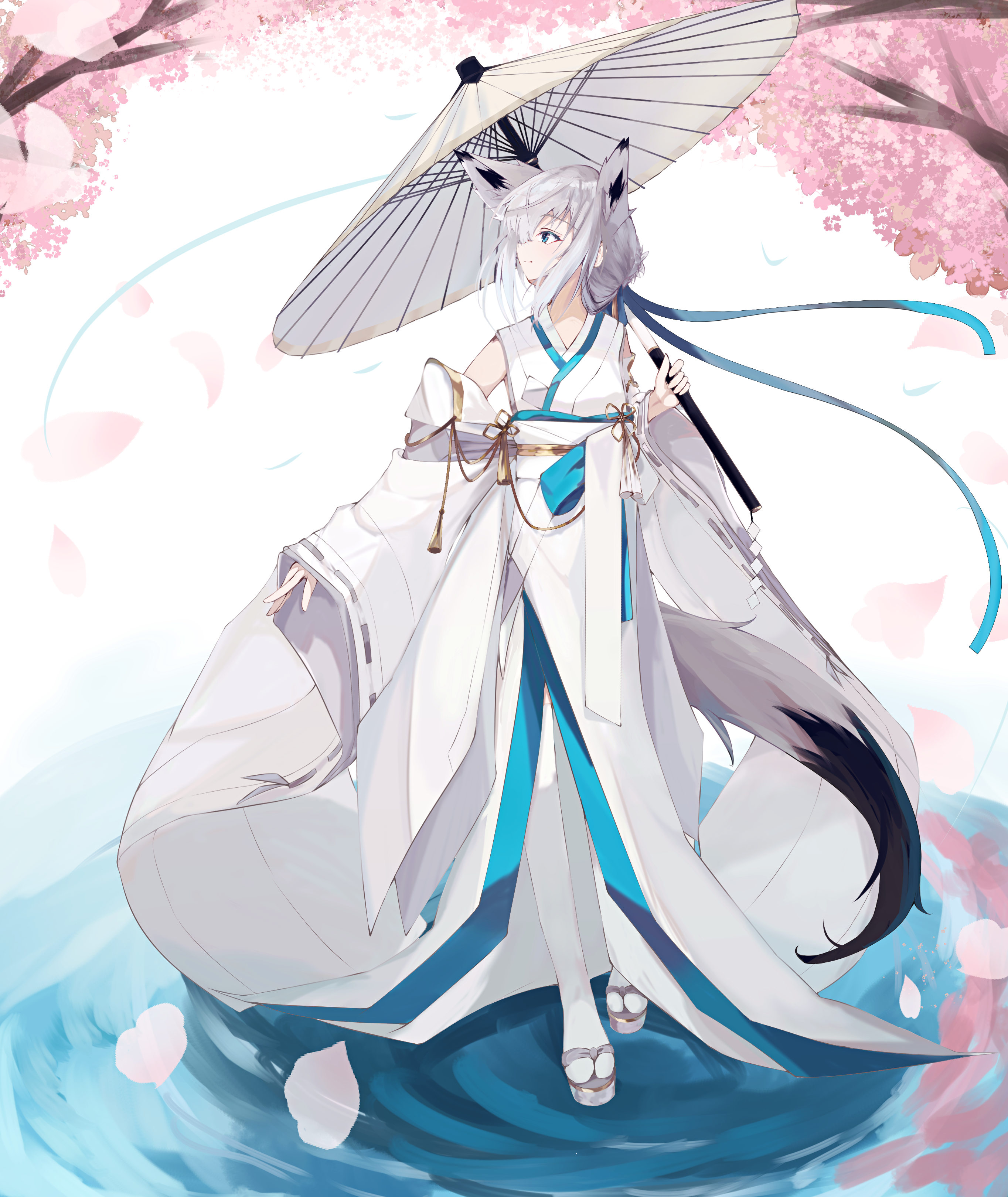 1girl absurdres animal_ears azur_lane blue_eyes cherry_blossoms closed_mouth detached_sleeves fox_ears fox_girl fox_tail full_body hair_between_eyes hair_bun highres holding holding_umbrella japanese_clothes kawakaze_(azur_lane) kawakaze_(unsullied_white_fox)_(azur_lane) kimono light_smile long_sleeves looking_to_the_side natsuki_(natsu_1936) official_alternate_costume oil-paper_umbrella platform_sandals ribbon-trimmed_clothes ribbon-trimmed_sleeves ribbon_trim sandals sash solo tail thighhighs uchikake umbrella white_hair white_kimono white_thighhighs wide_sleeves