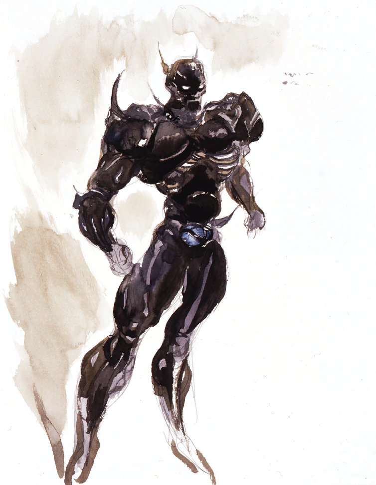 1boy amano_yoshitaka armor black_armor cecil_harvey clenched_hand dark_knight_(final_fantasy) final_fantasy final_fantasy_iv full_body mask muscular muscular_male no_pupils official_art pauldrons shoulder_armor solo spiked_pauldrons spikes third-party_source traditional_media