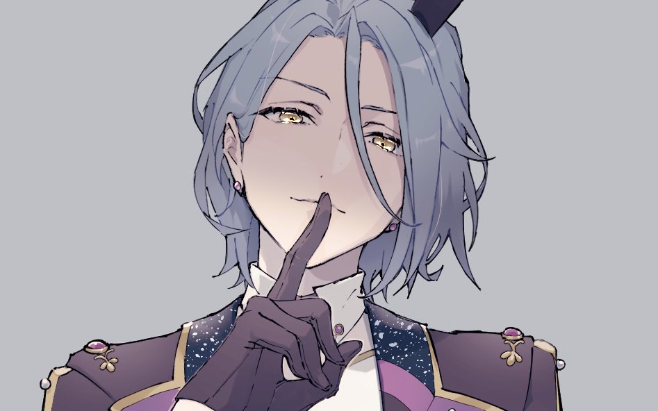 1boy blue_hair closed_mouth commentary_request cropped earrings ensemble_stars! finger_to_mouth gloves grey_background hair_behind_ear hair_between_eyes himeru_(ensemble_stars!) iroha_(nakaba0912) jacket jewelry light_smile long_hair_between_eyes looking_at_viewer male_focus purple_gloves purple_jacket shirt short_hair shushing simple_background solo stud_earrings variant_set white_shirt yellow_eyes