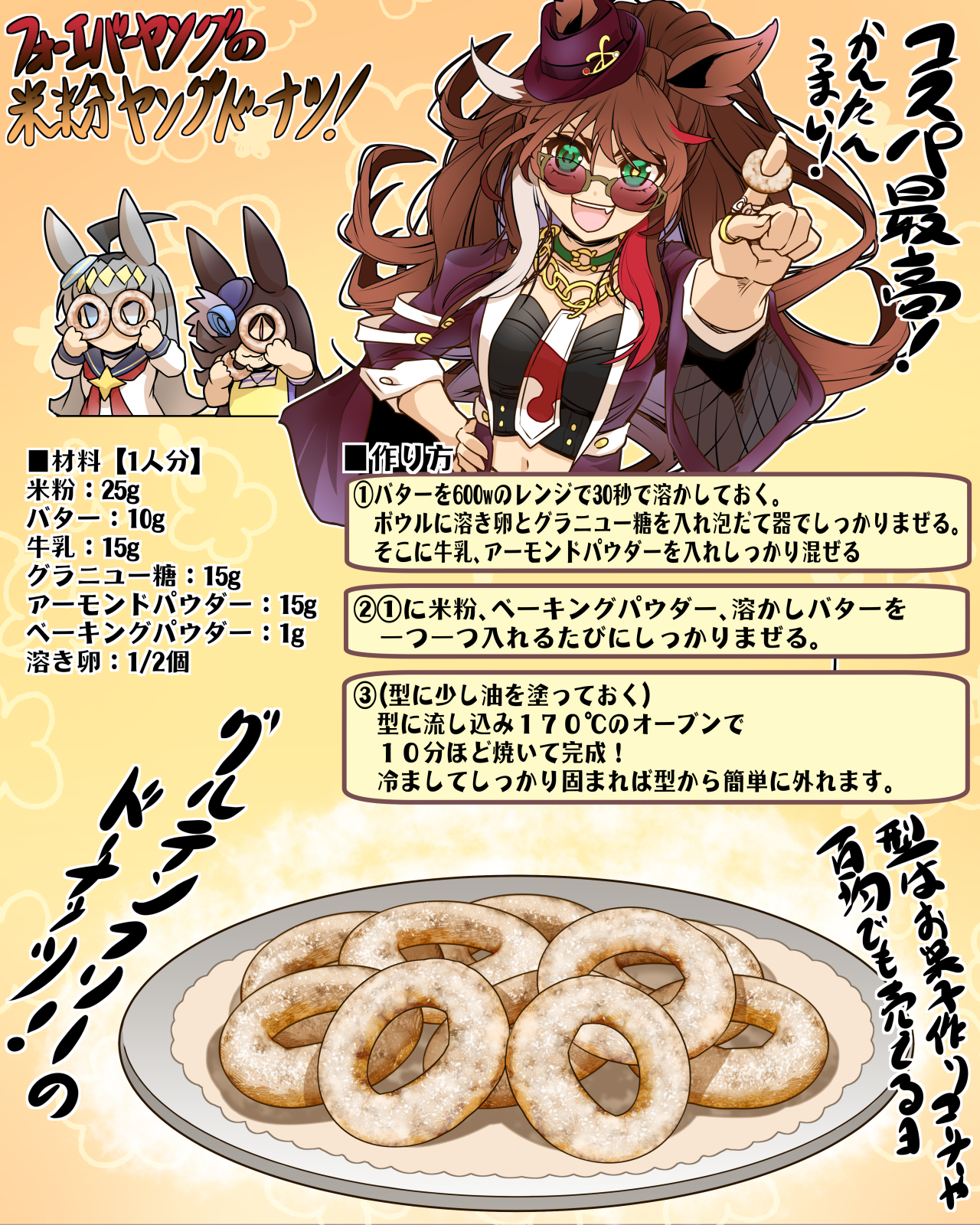 3girls ahoge animal_ears apron black_shirt blue_eyes blue_flower blue_hat blue_rose blue_sailor_collar breasts brooch brown_hair choker closed_mouth commentary_request donut ears_through_headwear eating fedora flipped_hair flower food forever_young_(racing)_(umamusume) forever_young_(umamusume) green_choker green_eyes grey_hair hair_between_eyes hair_over_one_eye hat hat_flower highres hisahiko holding holding_donut holding_food horse_ears horse_girl jacket jewelry long_hair long_sleeves looking_at_viewer midriff multicolored_hair multiple_girls navel neckerchief necktie oguri_cap_(starlight_beat)_(umamusume) oguri_cap_(umamusume) open_mouth purple-tinted_eyewear purple_eyes purple_shirt red-tinted_eyewear red_jacket red_neckerchief red_streaks rice_shower_(umamusume) rose sailor_collar sailor_shirt school_uniform shirt smile speech_bubble star_brooch streaked_hair sunglasses tilted_headwear tinted_eyewear tracen_school_uniform translation_request umamusume white_necktie white_sailor_collar white_streaks yellow_apron
