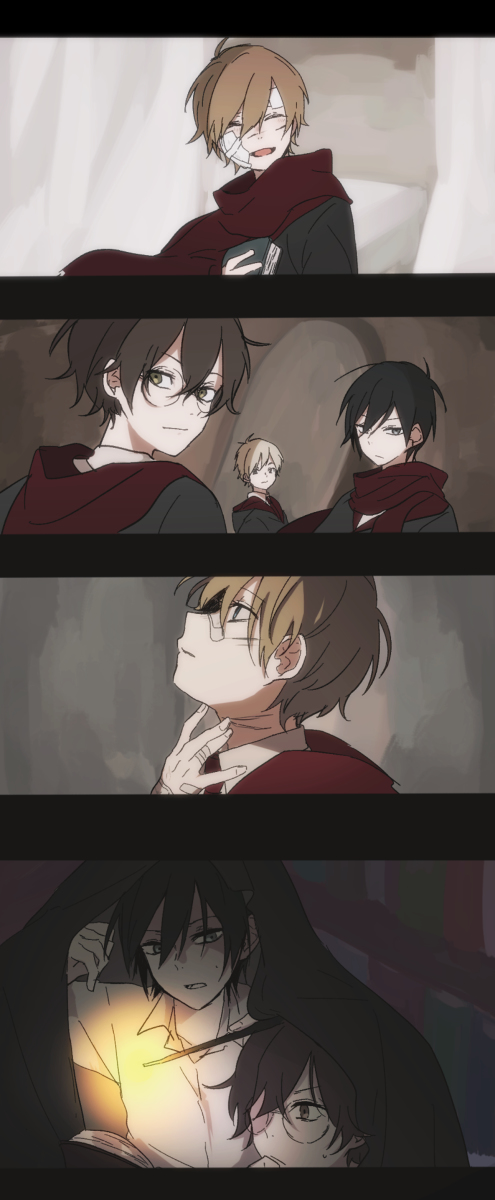 4boys bandaged_hand bandages bandaid bandaid_on_face bandaid_on_hand bandaid_on_nose black_hair brown_hair cloak closed_eyes closed_mouth collar glasses hair_between_eyes harry_potter_(series) james_potter looking_at_another male_focus multiple_boys panels peter_pettigrew profile remus_lupin ronn_hp scarf shirt short_hair sirius_black sweat sweatdrop wand white_shirt wing_collar wizarding_world