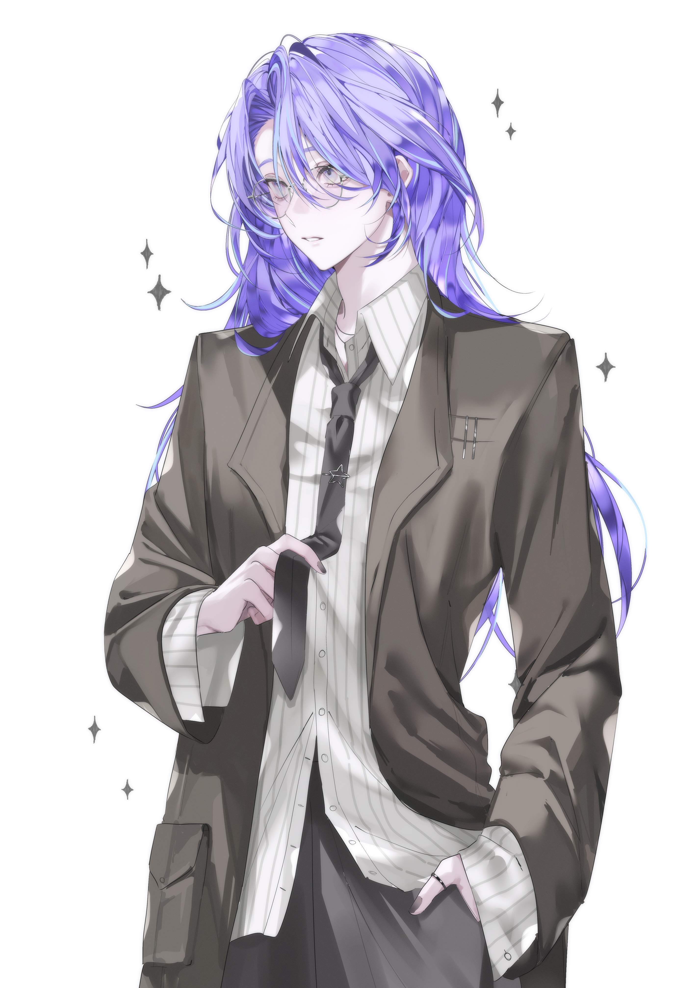 1boy absurdres alternate_costume bespectacled black_necktie blue_hair brown_coat brown_nails brown_pants coat commentary_request cowboy_shot glasses grey_eyes highres hoshirube_sho kokuto_(bsmilk) long_hair long_sleeves looking_to_the_side male_focus multicolored_hair nail_polish necktie nijisanji pants playing_with_own_necktie purple_hair shirt simple_background solo sparkle streaked_hair striped_clothes striped_shirt thumb_ring vertical-striped_clothes vertical-striped_shirt virtual_youtuber white_background white_shirt