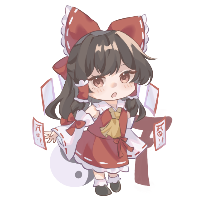1girl ascot blush bow brown_eyes brown_hair carin_(c_arin1012) chibi chibi_only commentary_request detached_sleeves frilled_bow frilled_hair_tubes frills full_body hair_bow hair_tubes hakurei_reimu long_hair looking_at_viewer ofuda orb red_bow red_skirt ribbon-trimmed_skirt ribbon-trimmed_sleeves ribbon_trim simple_background skirt skirt_set socks solo torii touhou white_background white_socks yellow_ascot yin_yang yin_yang_orb