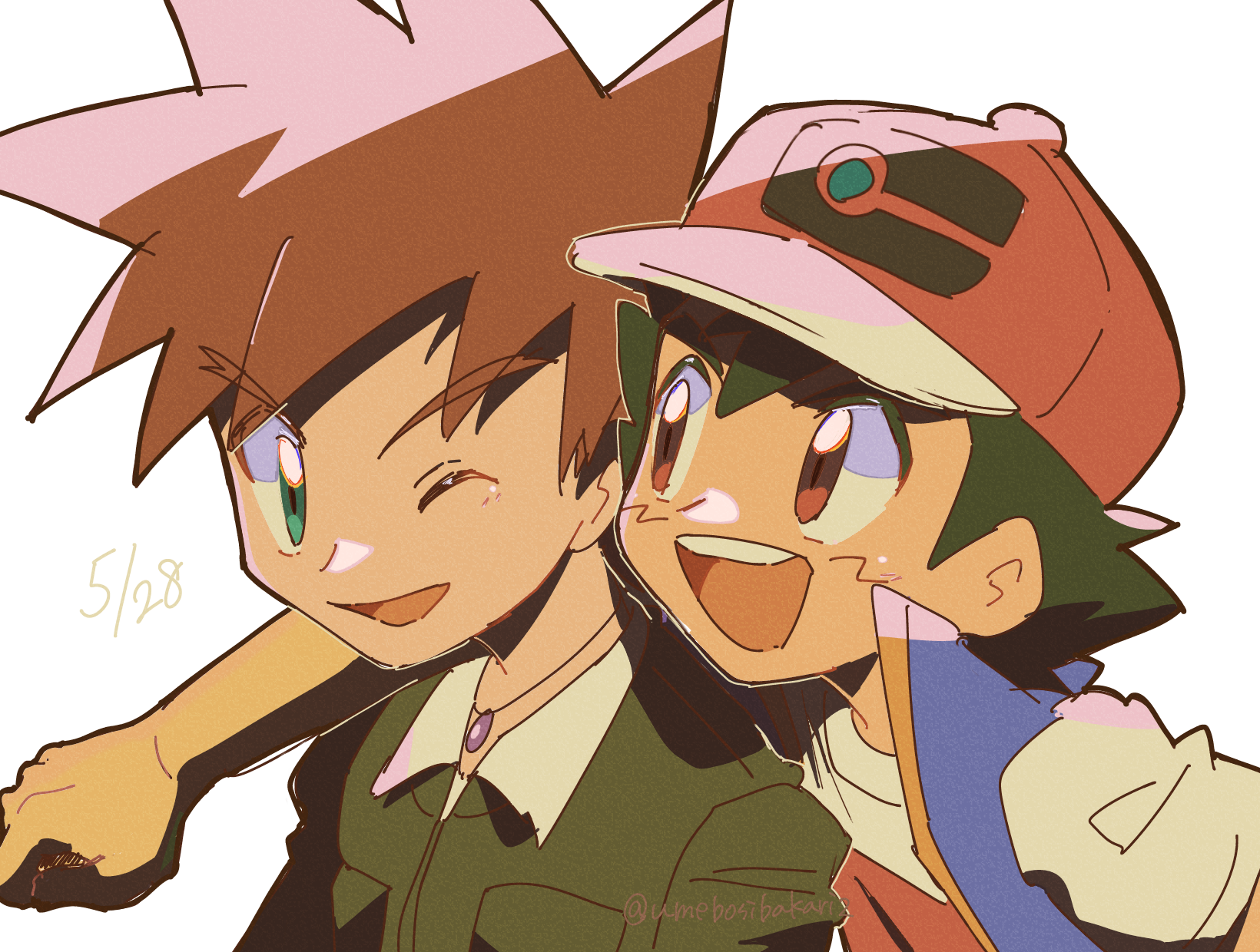 2boys ash_ketchum baseball_cap black_hair brown_eyes brown_hair commentary_request gary_oak green_eyes hat highres male_focus multiple_boys nintendo one_eye_closed open_mouth pokemon pokemon_(anime) pokemon_journeys red_hat short_hair simple_background smile spiked_hair teeth twitter_username umebosibakari2 upper_teeth_only v-shaped_eyebrows white_background