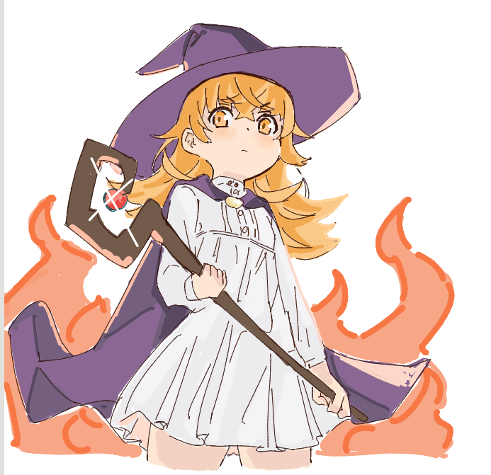 1girl cape dress fire hat holding holding_staff juliette_(mushoku_tensei) looking_at_viewer mage_staff medium_hair mushoku_tensei orange_eyes orange_hair pleated_dress purple_cape solo staff tokita_(mag0) white_background witch_hat