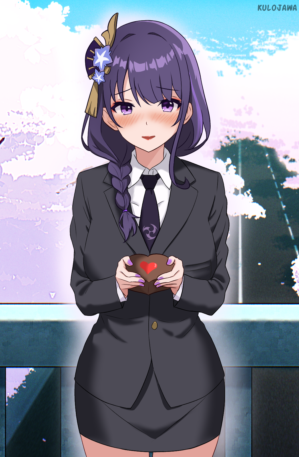 1girl alternate_costume artist_name black_jacket black_skirt black_suit blue_sky blunt_bangs blurry blush box braid business_suit cherry_blossoms chocolate collared_shirt commentary day depth_of_field english_commentary formal_clothes genshin_impact hair_ornament head_tilt heart-shaped_box highres holding jacket kulojawa long_sleeves looking_at_viewer necktie nose_blush outdoors pov purple_nails raiden_shogun shade shirt single_braid skirt sky solo standing suit suit_jacket upper_body valentine white_shirt