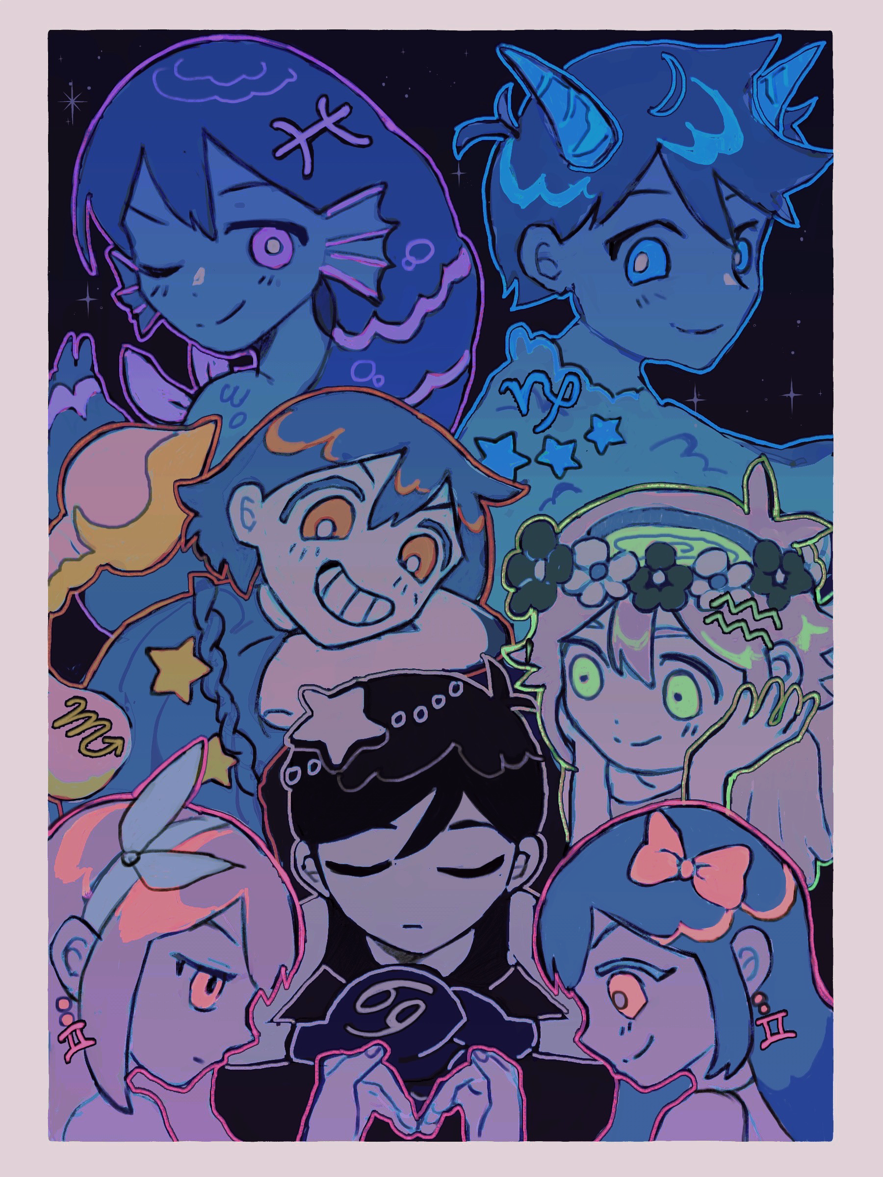 3girls 4boys absurdres alternate_eye_color antenna_hair aubrey_(faraway)_(omori) aubrey_(headspace)_(omori) aubrey_(omori) basil_(headspace)_(omori) basil_(omori) black_hair blue_eyes blue_hairband blush bow bright_pupils brother_and_sister brothers closed_eyes closed_mouth dual_persona earrings flower_wreath green_eyes green_hair grin hair_bow hairband head_wreath highres horns jewelry long_hair looking_at_another looking_at_viewer mari_(headspace)_(omori) mari_(omori) milkymilkyshark multiple_boys multiple_girls omori omori_(omori) one_eye_closed open_mouth pink_bow pink_eyes purple_eyes purple_hair short_hair siblings sidelocks smile teeth white_pupils