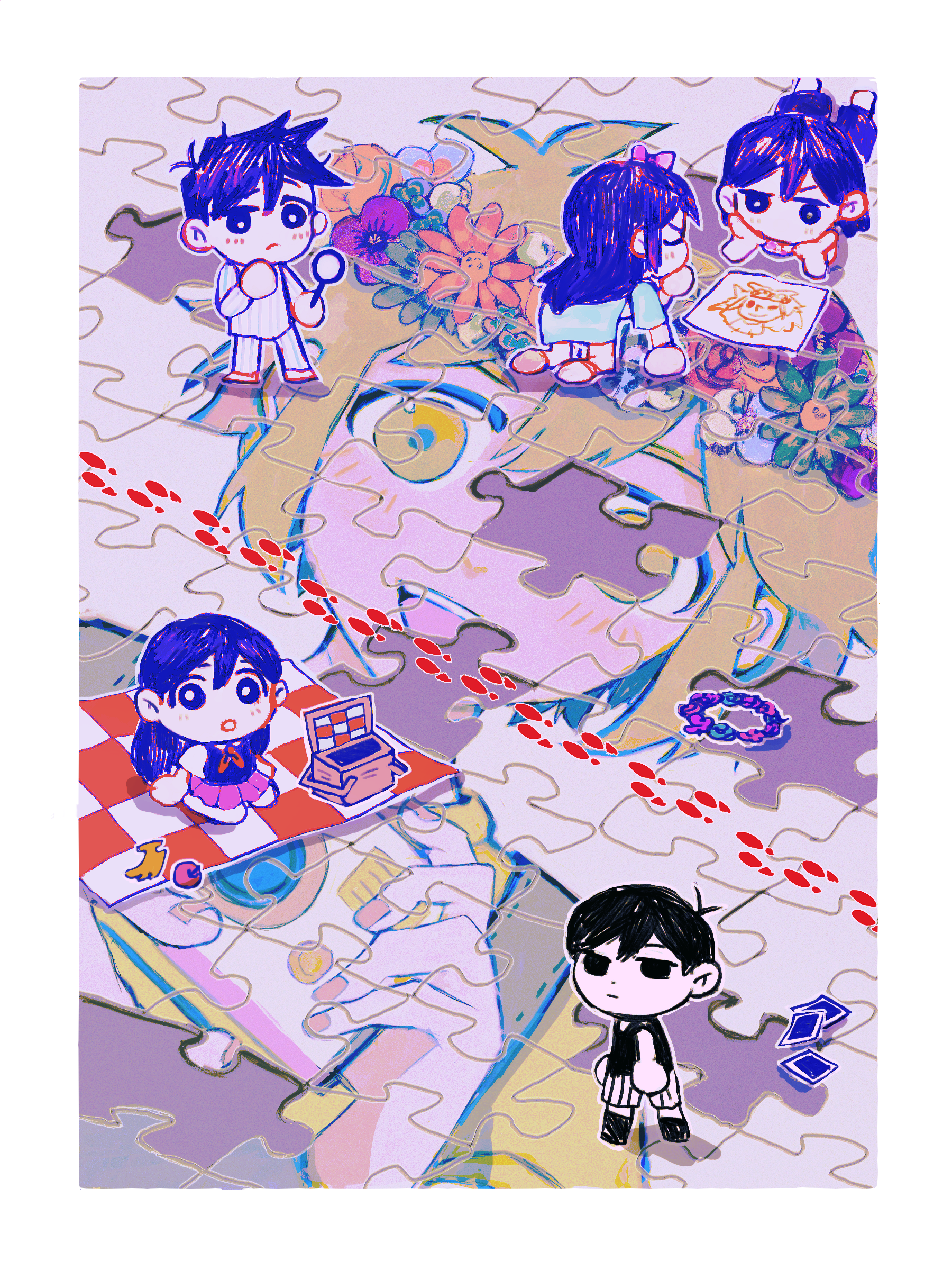 2girls 3boys absurdres all_fours antenna_hair aubrey_(headspace)_(omori) aubrey_(omori) barefoot basil_(headspace)_(omori) basil_(omori) black_eyes black_hair black_socks bow bright_pupils brother_and_sister brothers checkered_blanket chibi closed_eyes closed_mouth double-parted_bangs flower flower_wreath hair_between_eyes hair_bow head_wreath_removed hero_(headspace)_(omori) hero_(omori) highres jigsaw_puzzle kel_(headspace)_(omori) kel_(omori) long_hair long_sleeves lying magnifying_glass mari_(headspace)_(omori) mari_(omori) milkymilkyshark multiple_boys multiple_girls omori omori_(omori) on_stomach open_mouth pajamas pants paper picnic_basket picnic_blanket pink_bow purple_eyes purple_hair puzzle seiza short_hair shorts siblings sidelocks sitting socks standing striped_clothes striped_pajamas striped_pants striped_shorts vertical-striped_clothes vertical-striped_pajamas vertical-striped_pants vertical-striped_shorts white_pajamas white_pants white_pupils white_shorts