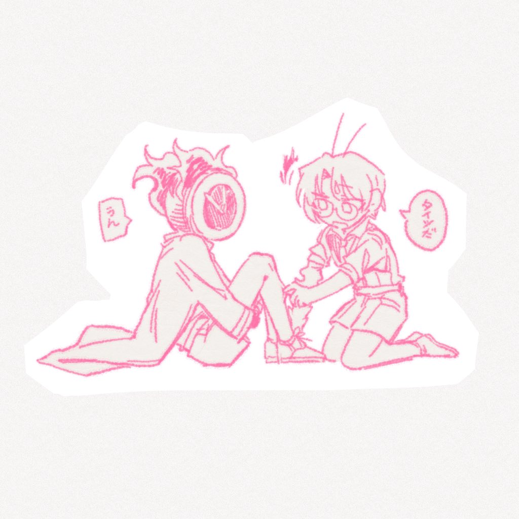 1boy 1other :< ^^^ absurdres aged_down ahoge antenna_hair antennae arms_behind_legs arthropod_limbs barefoot blush breast_pocket child clenched_hand clock closed_mouth clothes_pull coat collared_shirt dante_(limbus_company) dngrumauma embarrassed facial_hair fire formal_clothes from_side frown full_body glasses gloves gregor_(project_moon) grey_background hair_intakes half-closed_eyes highres hugging_own_legs jitome kneeling knees_up lapels leaning_forward leggings leggings_pull limbus_company long_hair long_sleeves looking_at_another looking_at_viewer looking_down looking_to_the_side low_ponytail male_focus necktie notched_lapels object_head open_clothes open_coat open_mouth outline parted_bangs photoshop_(medium) pinching pink_them pink_theme pocket ponytail pouch project_moon prosthetic_head pulling_another's_clothes seiza semi-rimless_eyewear shirt shoes short_hair shorts simple_background sitting sketch sleeves_rolled_up speech_bubble surprised talking under-rim_eyewear vest white_outline