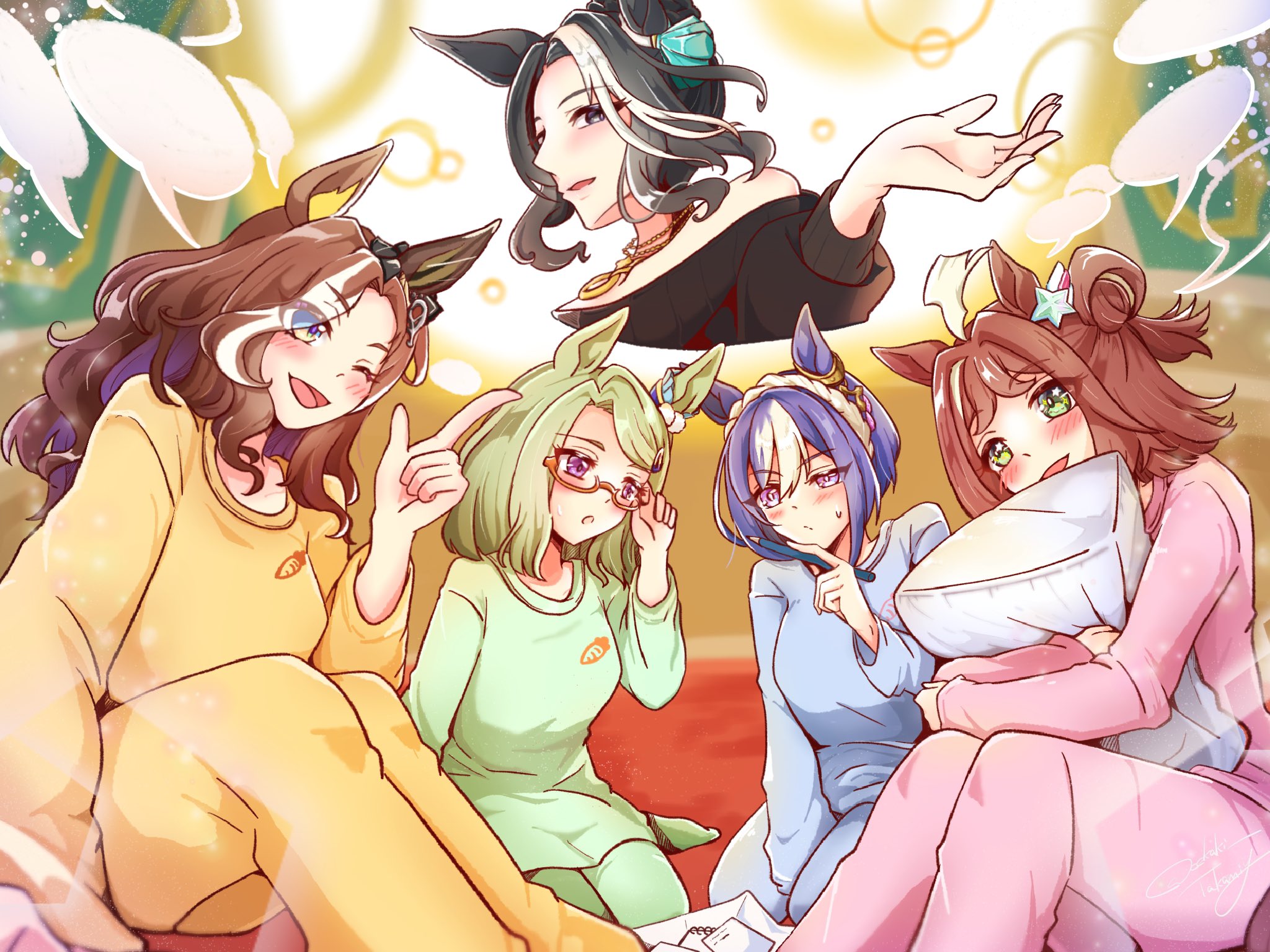 5girls ahoge air_messiah_(umamusume) alternate_costume animal_ears black_hair blue_eyes blue_hair blue_pajamas blush braid breasts brown_hair cesario_(umamusume) commentary_request crown_braid daring_heart_(umamusume) ear_covers glasses green_hair green_pajamas hair_between_eyes hair_ornament hairclip highres horse_ears horse_girl horse_tail long_hair mejiro_ramonu_(casual)_(umamusume) mejiro_ramonu_(umamusume) multicolored_hair multiple_girls oekaki_takamiy open_mouth pajamas pillow pink_pajamas purple_eyes rhein_kraft_(umamusume) short_hair smile tail umamusume white_hair yellow_pajamas
