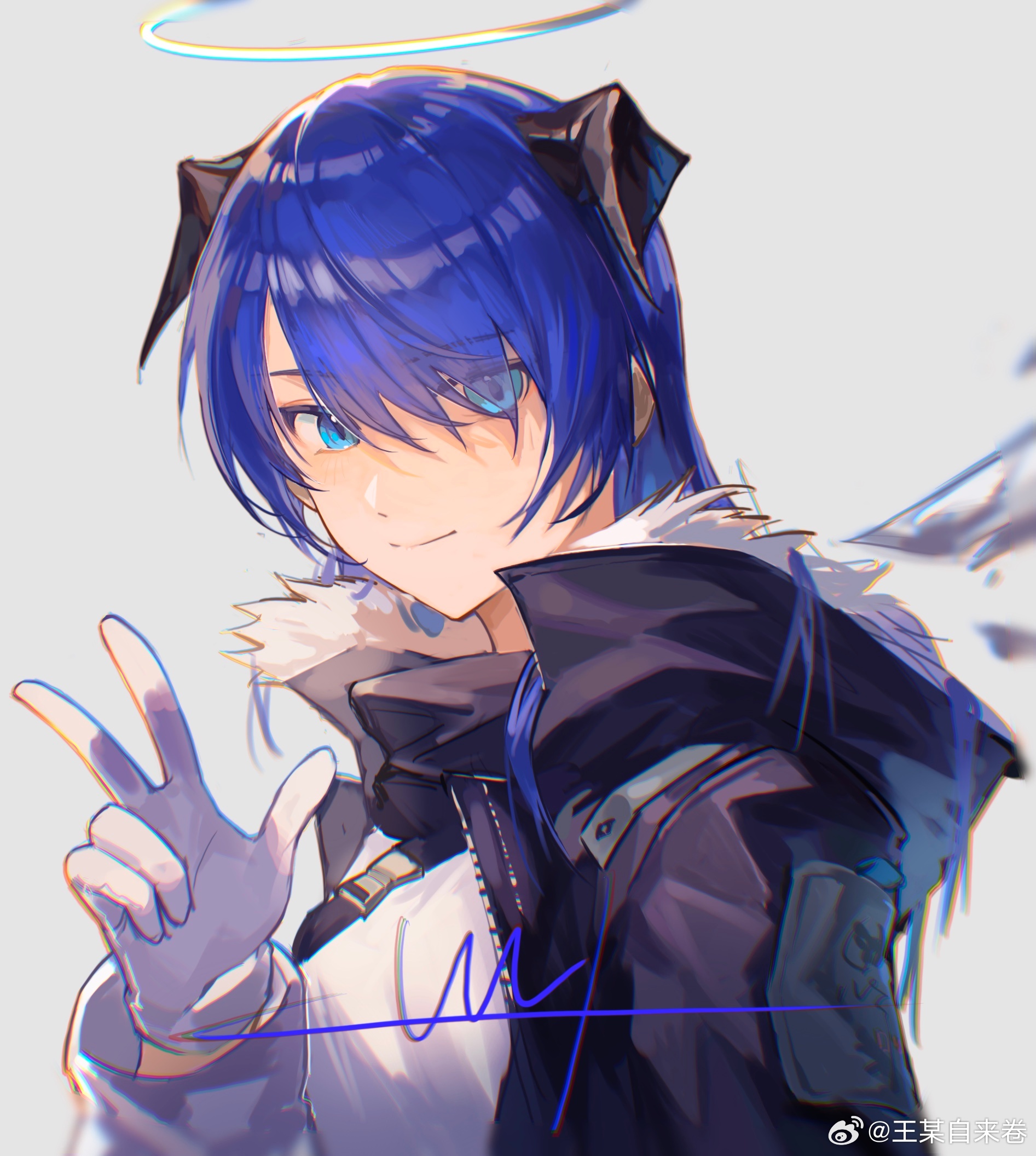 1girl arknights black_horns black_jacket blue_eyes blue_hair chinese_commentary chromatic_aberration closed_mouth commentary_request eyes_visible_through_hair fur-trimmed_hood fur_trim gloves grey_background grey_gloves hair_over_one_eye halo highres hood hood_down hooded_jacket horns jacket light_smile long_hair long_sleeves looking_at_viewer mostima_(arknights) portrait signature simple_background solo traditional_halo v wangmou_zilaojuan watermark weibo_watermark white_halo