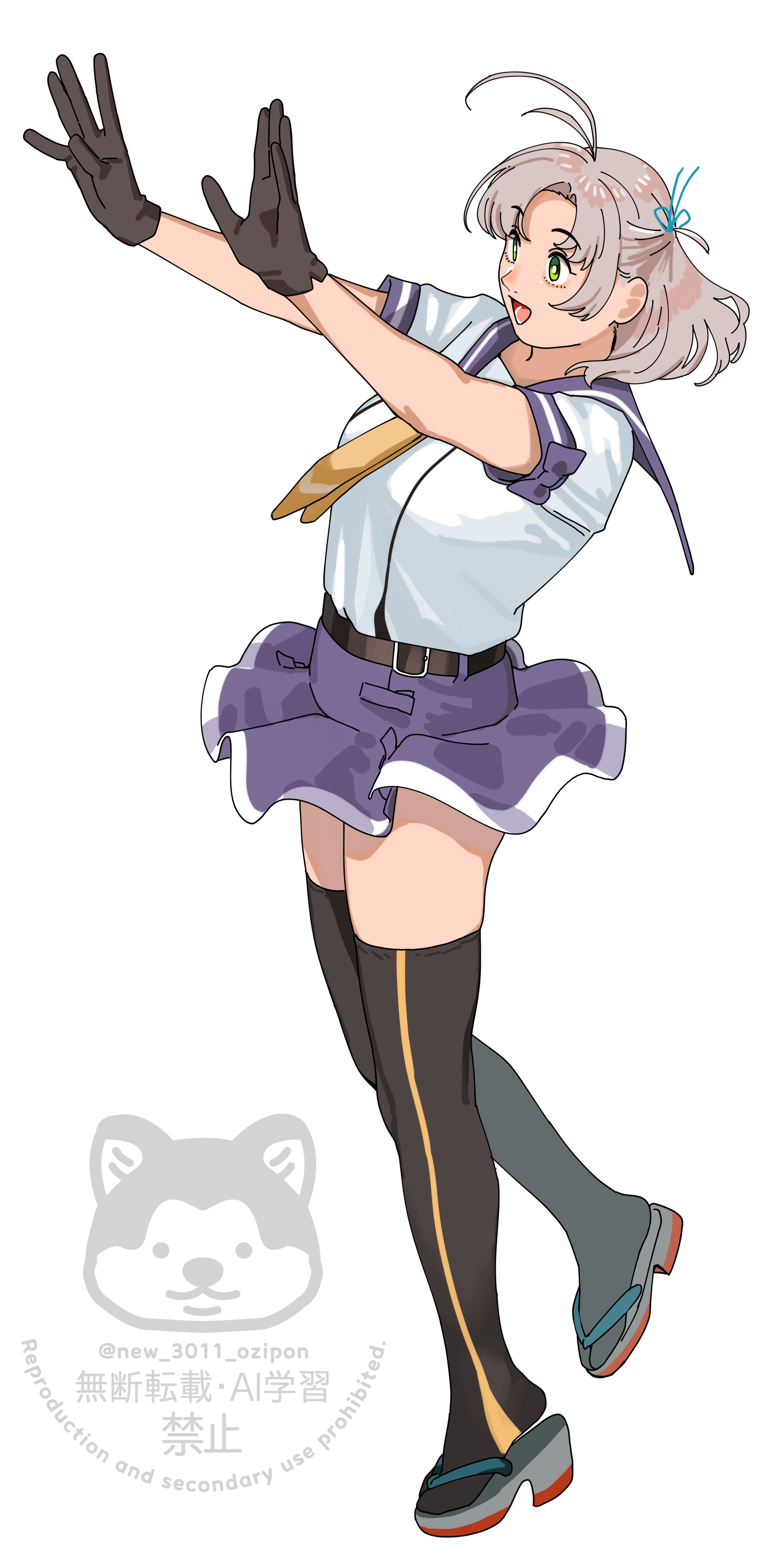 1girl absurdres antenna_hair black_gloves black_thighhighs breasts gloves green_eyes grey_hair hair_tie highres kantai_collection kinugasa_(kancolle) kinugasa_kai_ni_(kancolle) neckerchief ojipon open_mouth pleated_skirt purple_sailor_collar purple_skirt sailor_collar school_uniform serafuku short_sleeves simple_background skirt solo thighhighs twitter_username white_background yellow_neckerchief