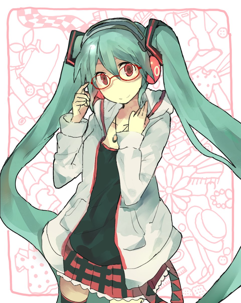 1girl aqua_hair cowboy_shot glasses hair_ornament hands_up hatsune_miku hatsune_miku_(natural) headphones highres hood hood_down hoodie jewelry long_hair long_sleeves looking_at_viewer necklace open_clothes open_hoodie pink_eyes project_diva_(series) red-framed_eyewear skirt smile solo thighhighs totpk_(totxyza) very_long_hair vocaloid