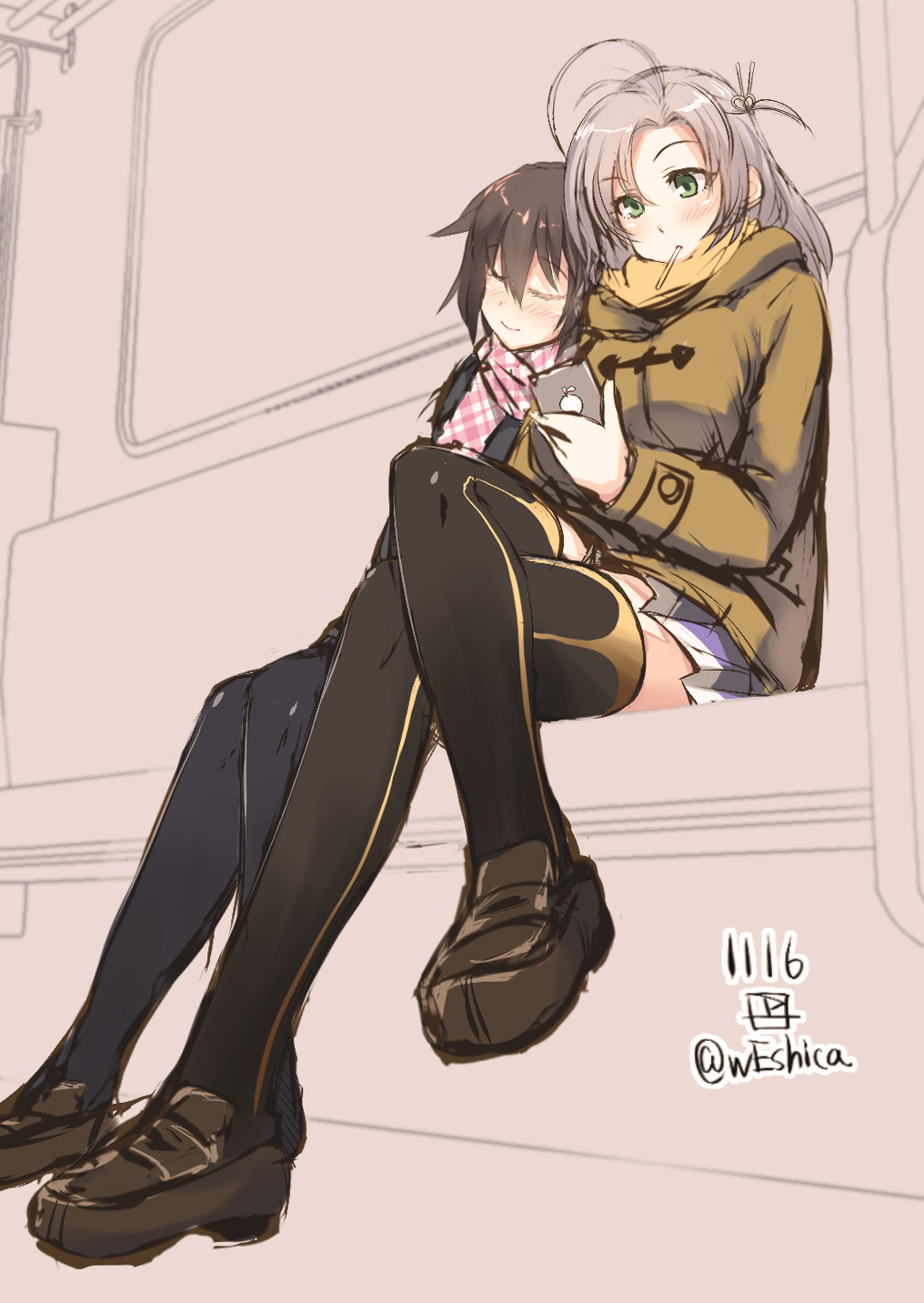 2girls alternate_costume antenna_hair black_thighhighs blush brown_hair brown_jacket brown_shoes closed_eyes crossed_legs dated furutaka_(kancolle) green_eyes hair_tie highres hood hooded_jacket jacket kantai_collection kinugasa_(kancolle) kinugasa_kai_ni_(kancolle) leaning_on_person leaning_to_the_side loafers long_hair long_sleeves monochrome_background multiple_girls pink_scarf pleated_skirt scarf shoes sitting skirt smile thighhighs train twitter_username weshika