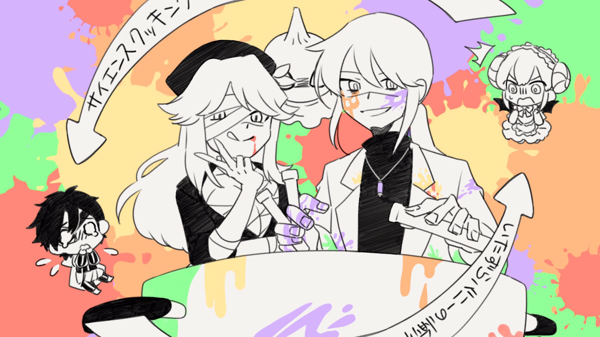:q bat_wings character_request chibi chibi_inset colorful_background cooking_pot copyright_request dress gen_3_pokemon hat highres lab_coat long_hair nervous nintendo paint_splatter paint_splatter_on_face pokemon pokemon_(creature) pokenasi scientist short_hair shuppet smile splatter_background sweatdrop teeth tongue tongue_out wings