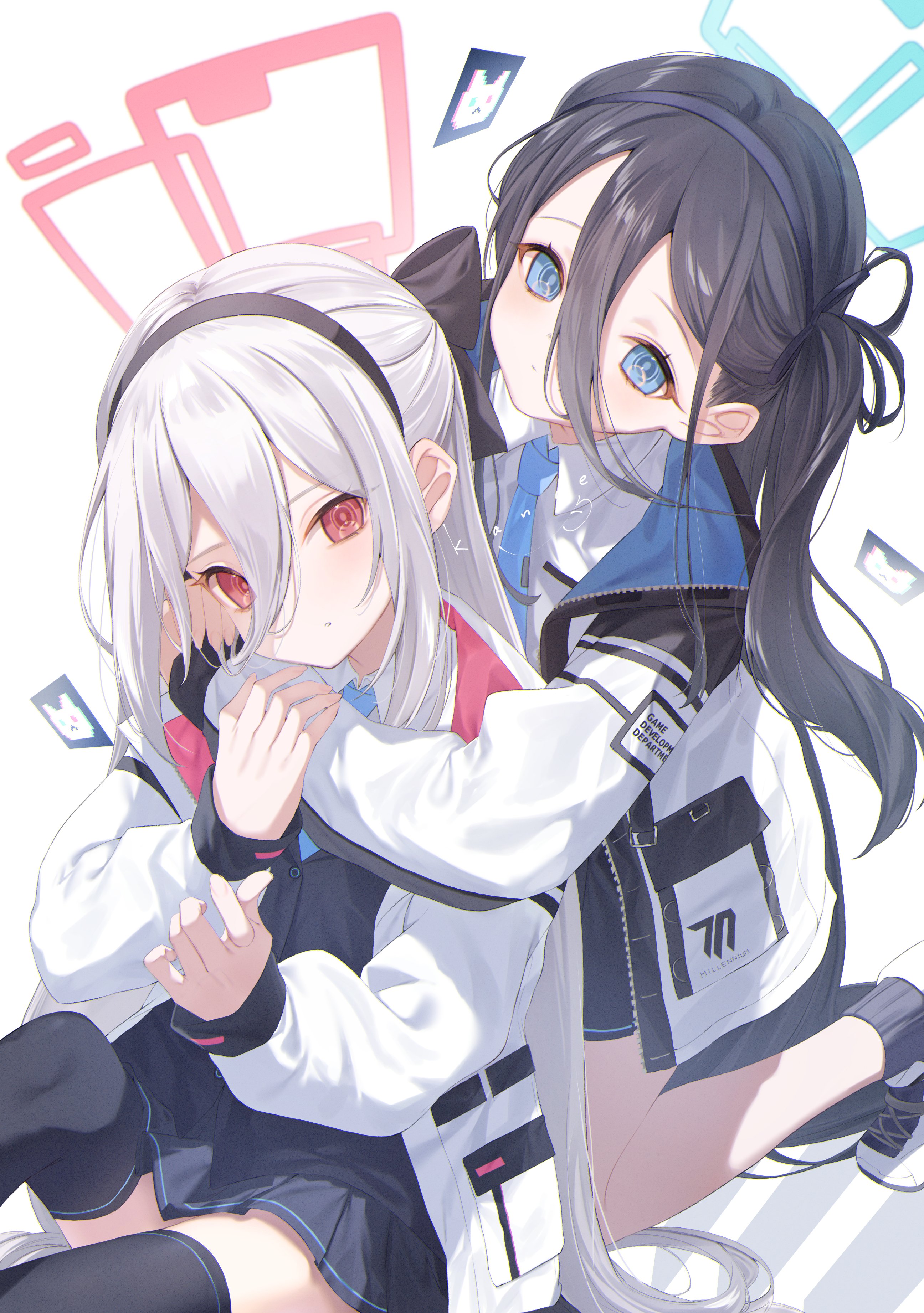 2girls absurdres aqua_halo aris_(blue_archive) black_hair black_hairband black_skirt black_thighhighs blue_archive blue_eyes blue_necktie double-parted_bangs hair_between_eyes hairband halo highres hug hug_from_behind jacket kanae_(inorin05kanae) kei_(blue_archive) kei_(new_body)_(blue_archive) long_hair long_hair_between_eyes looking_at_viewer millennium_science_school_logo multicolored_jacket multiple_girls necktie one_side_up pink_halo pleated_skirt rectangular_halo red_eyes ringed_eyes skirt thighhighs two-tone_jacket white_hair white_jacket