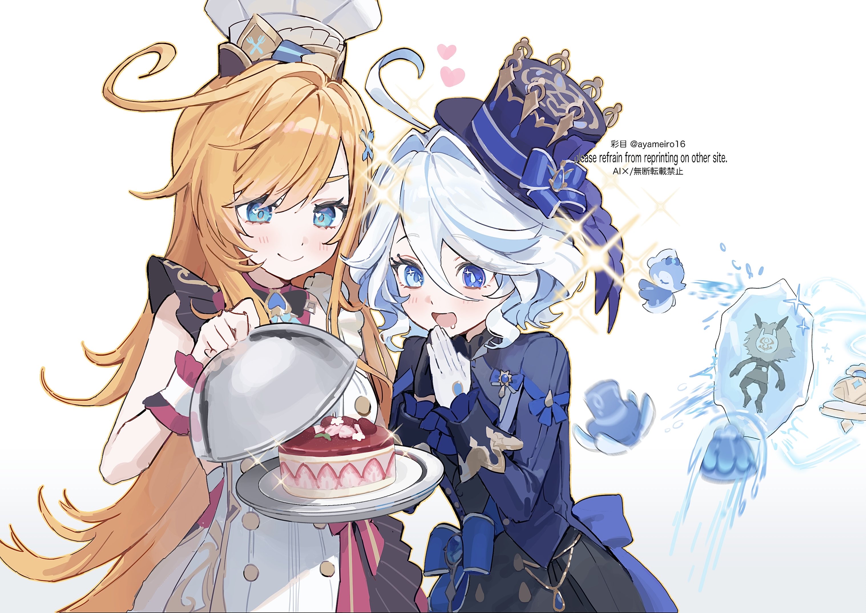 2girls ahoge ascot ayame_(ayameiro) blonde_hair blue_ascot blue_eyes blue_gem blue_hair blue_hat blue_jacket blush cake chef_hat drooling escoffier_(genshin_impact) food fruit furina_(genshin_impact) gem genshin_impact gentilhomme_usher gloves hat heterochromia highres hilichurl_(genshin_impact) holding holding_lid holding_plate jacket lid long_hair long_sleeves looking_at_object mademoiselle_crabaletta multicolored_hair multiple_girls open_mouth own_hands_together plate smile strawberry strawberry_cake streaked_hair surintendante_chevalmarin two-tone_hair upper_body white_background white_hair white_hat wrist_cuffs