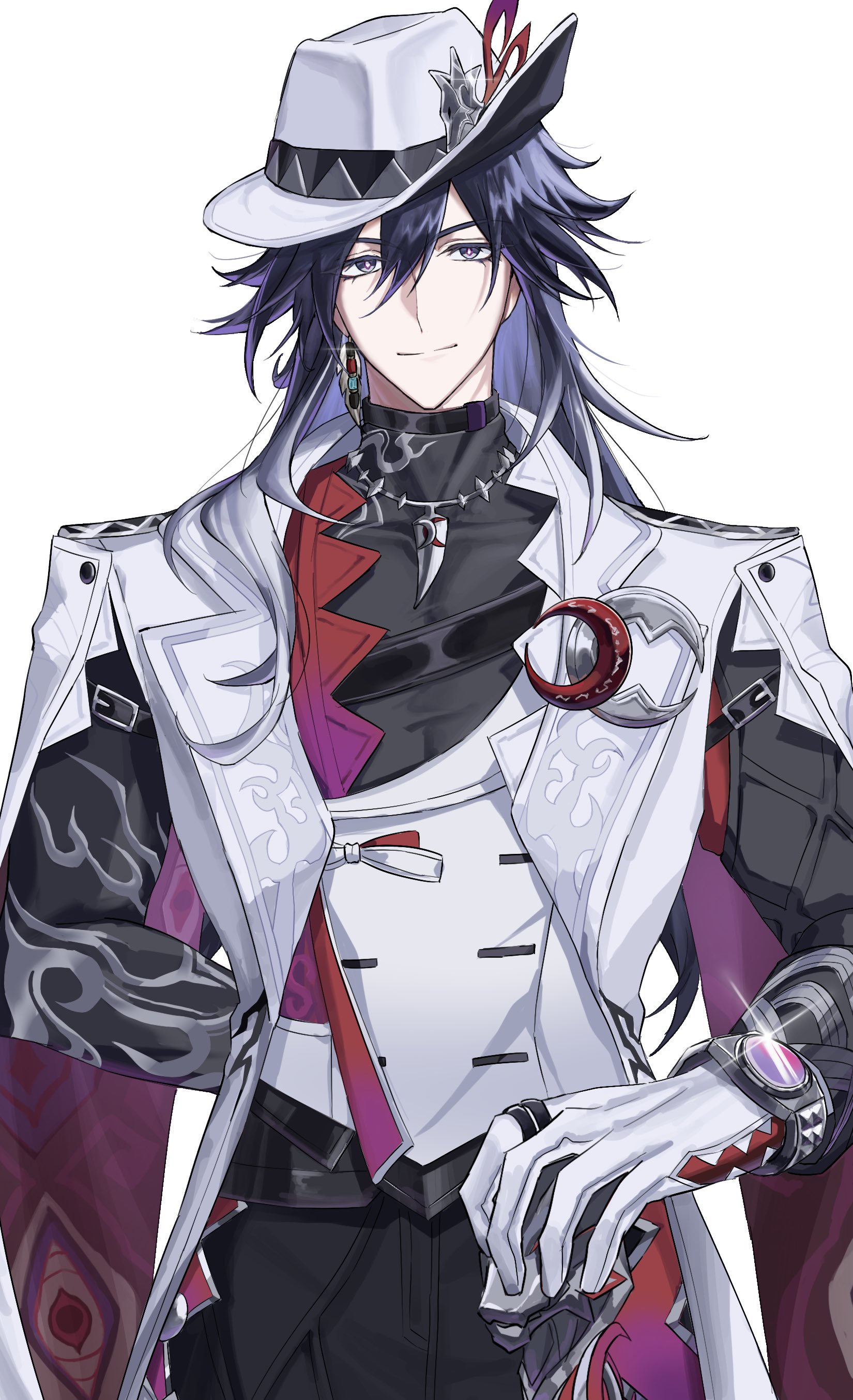 1boy absurdres ashveil_(honkai:_star_rail) black_hair black_pants black_shirt cane commentary crescent crescent_pin fedora gloves gradient_hair hat hat_ornament highres holding holding_cane honkai:_star_rail honkai_(series) jacket jewelry kano_kano_777 lapel_pin long_hair male_focus multicolored_hair necklace pants purple_eyes shirt simple_background solo tooth_necklace turtleneck watch white_background white_gloves white_hair white_hat white_jacket wristwatch