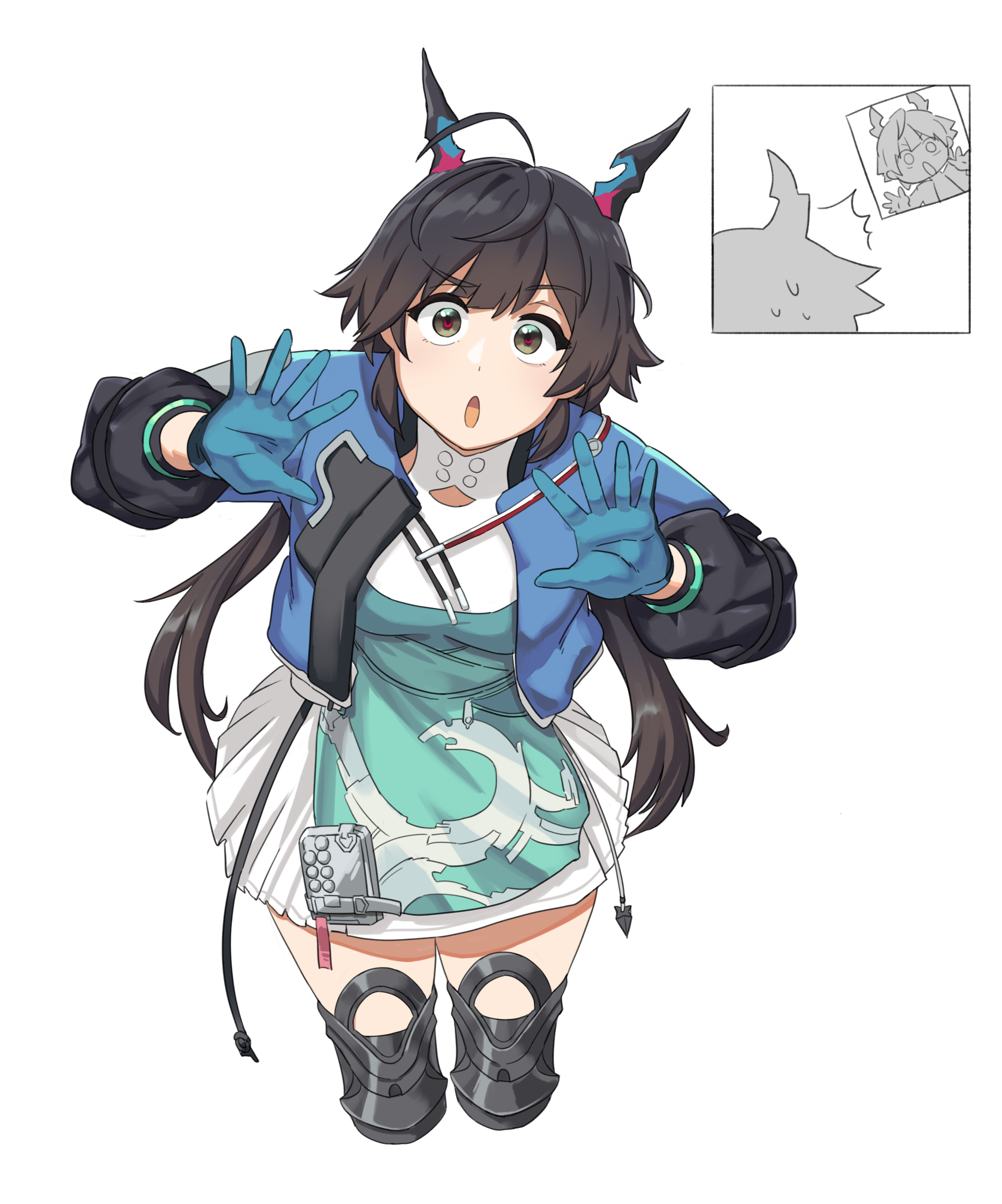1girl absurdres arknights arknights:_endfield black_boots black_gloves black_hair blue_gloves blue_horns blue_jacket boots bruce_guk chen_qianyu_(arknights) commentary cropped_legs dragon_girl dragon_horns dress eastern_dragon_horns gloves highres horns jacket long_hair long_sleeves looking_at_viewer multicolored_gloves open_clothes open_jacket open_mouth simple_background solo thigh_boots twintails two-sided_gloves two-tone_gloves white_background white_dress